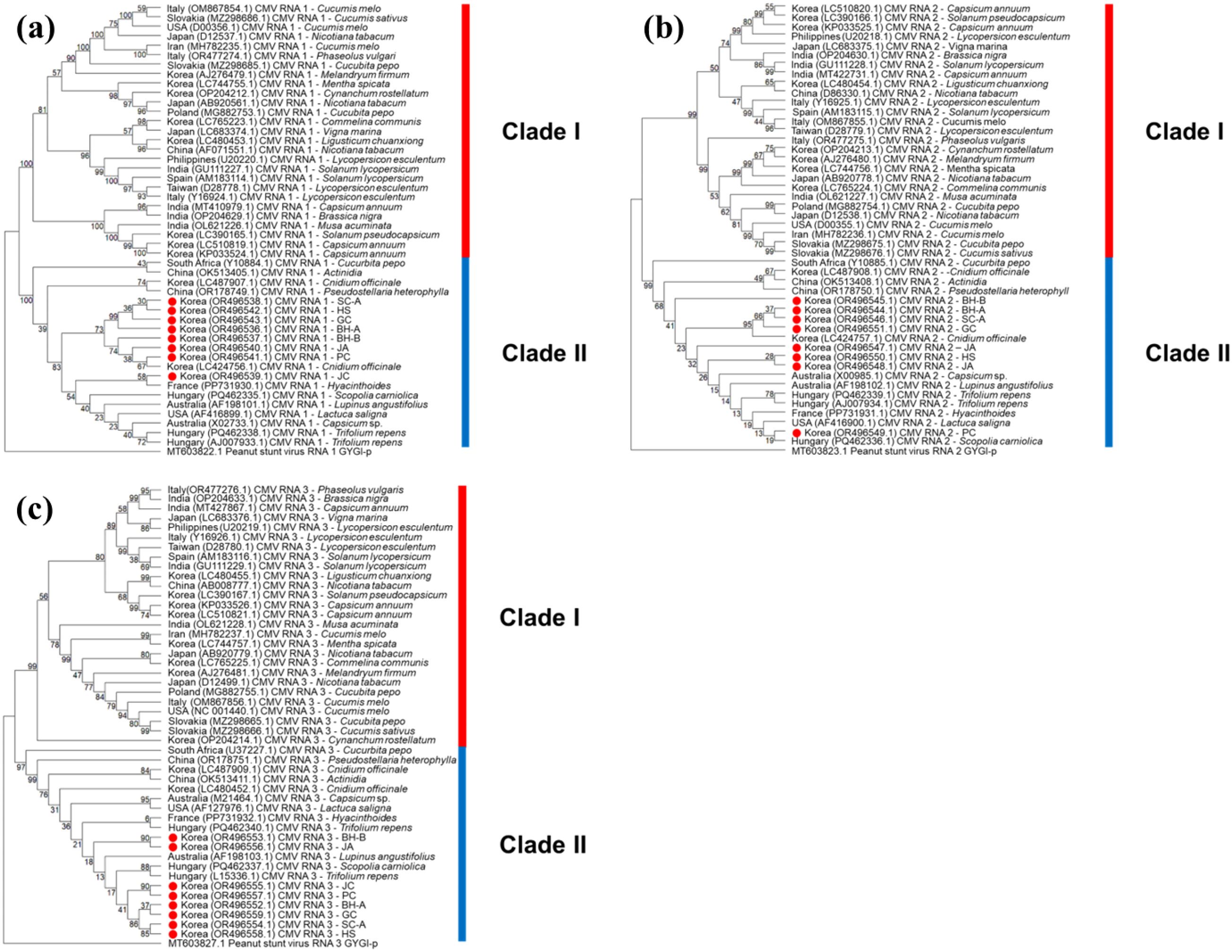 Figure 6. Neighbor‐joining phylogenies of CMV RNA segments from Cnidium officinale isolates. (a) CMV RNA 1, (b) CMV RNA 2, and (c) CMV RNA 3 complete genomes were aligned with reference sequences. Trees were inferred in MEGA11 using the neighbor‐joining method with 1,000 bootstrap replicates; bootstrap values ≥ 70% are displayed. Korean isolates from this study are marked in red, and branch lengths indicate nucleotide substitutions per site.