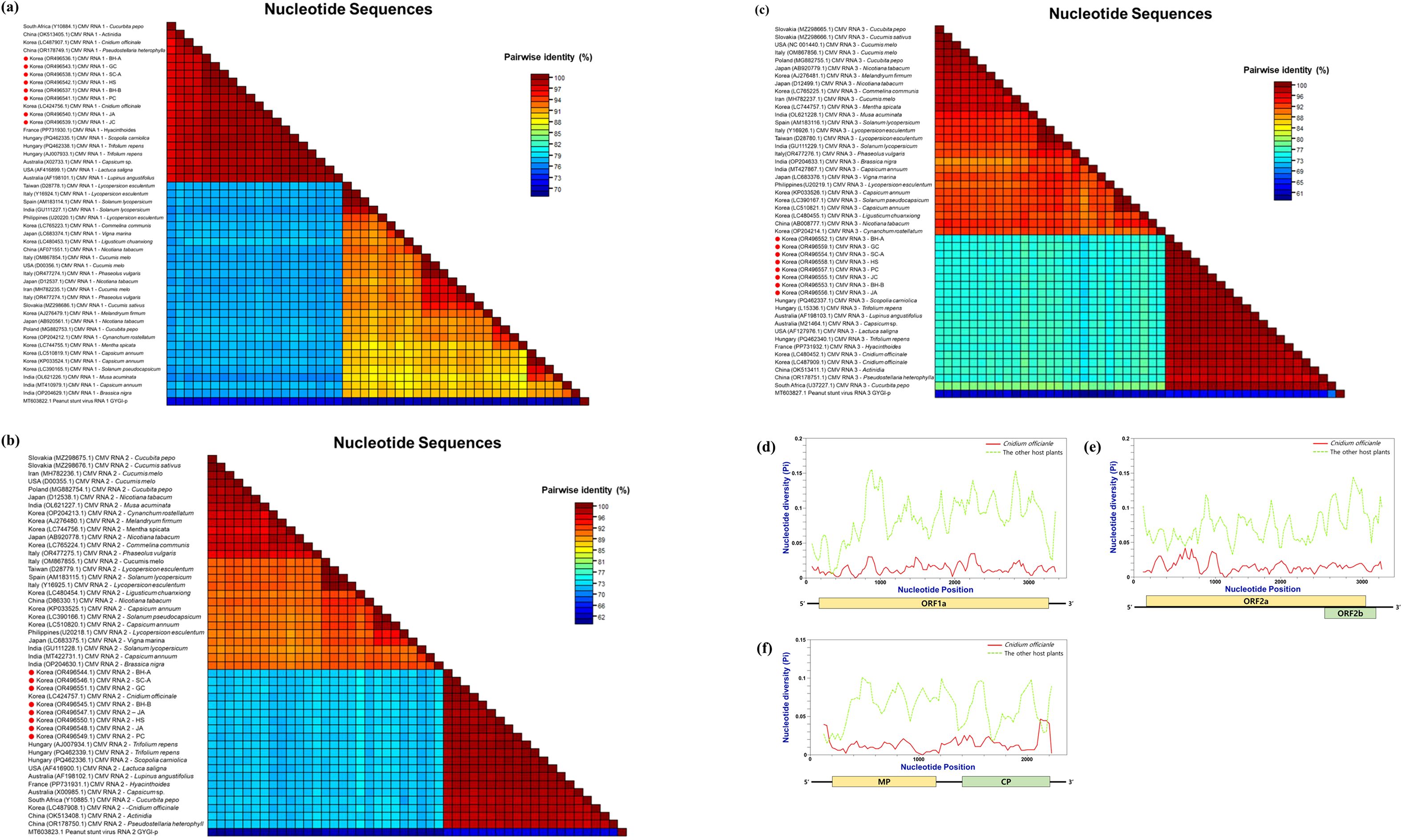 Figure 7. Pairwise identity matrices and sliding‐window nucleotide‐diversity profiles of CMV segments. (a) Pairwise percent‐identity matrix for CMV RNA 1 sequences (this study vs. references); (b) CMV RNA 2; (c) CMV RNA 3. In each matrix, cells in the upper triangle show percent identity (dark blue = high identity; light red = low identity), and cells in the lower triangle indicate percent divergence (mirror of the upper). (d–f) Sliding‐window nucleotide diversity (π) across (d) RNA 1, (e) RNA 2, and (f) RNA 3 alignments (window = 200 nt, step = 50 nt), calculated in DnaSP v6; the x‐axis is genome position, and the y‐axis is π. Reference isolate names appear on each axis, and Korean isolates are highlighted in bold.