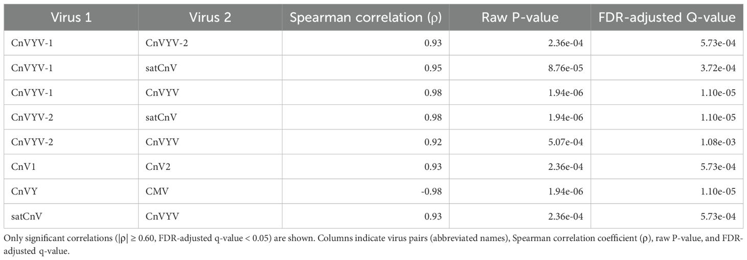In addition to the CnVYV complex-satCnV cluster, the co-occurrence network identified other notable associations. We found a robust positive correlation between two novel viruses, CnV1 and CnV2 (ρ ≈ 0.93, q < 0.001). Their strong co-occurrence suggests these viruses might share a common ecological or epidemiological link, such as being transmitted by the same vector or thriving under similar host conditions. It is also possible that one facilitates infection by the other, although further experiments would be needed to test any direct interactions.