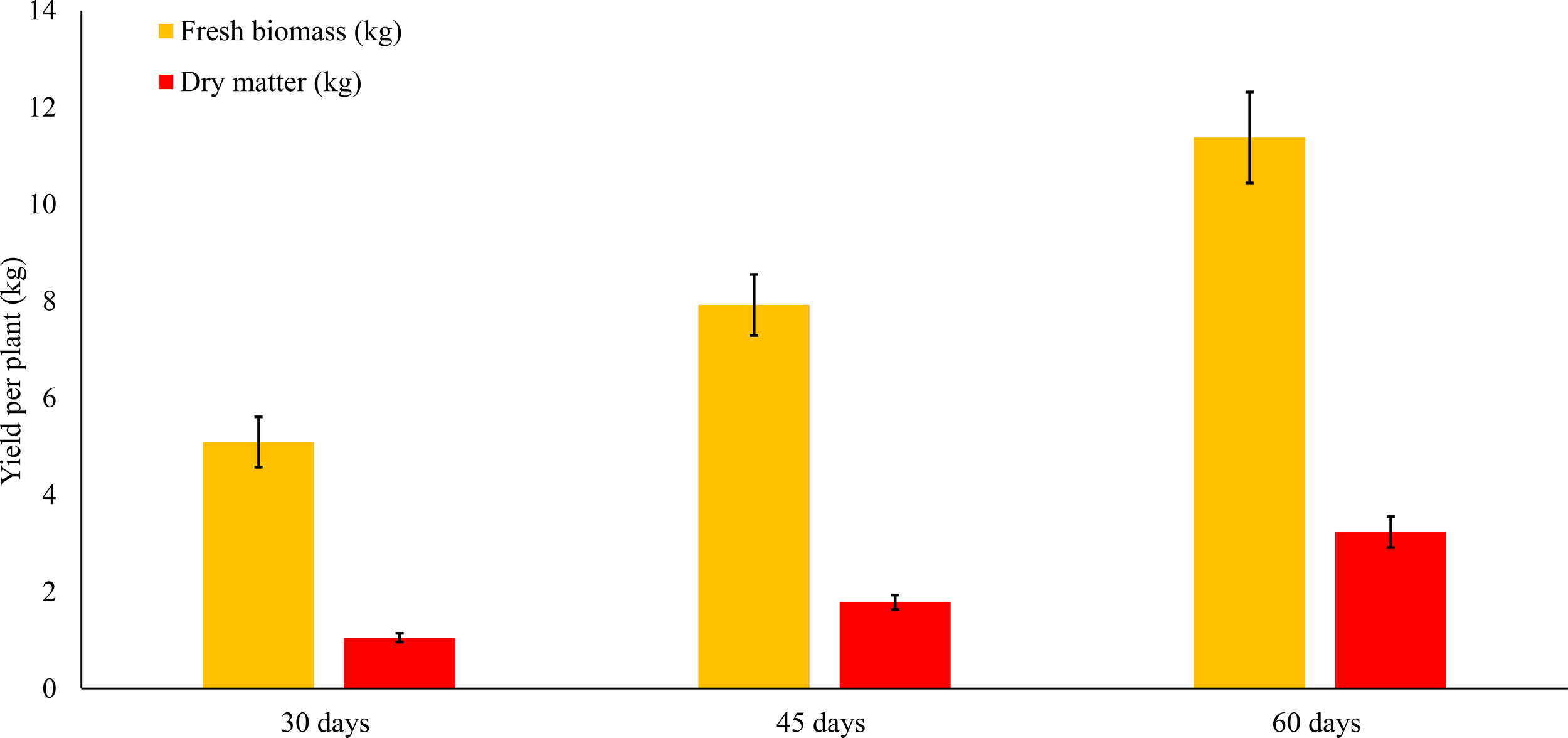Similarly, dry matter (DM) yield increased significantly with cutting age, from 1.51 ± 0.39 kg (30 days) to 2.28 ± 0.48 kg (45 days) and 3.45 ± 0.67 kg (60 days) (p < 0.001). The highest absolute DM content recorded at 60 days suggests this stage is optimal for maximizing usable forage volume, although this must be complemented with nutritional quality data.