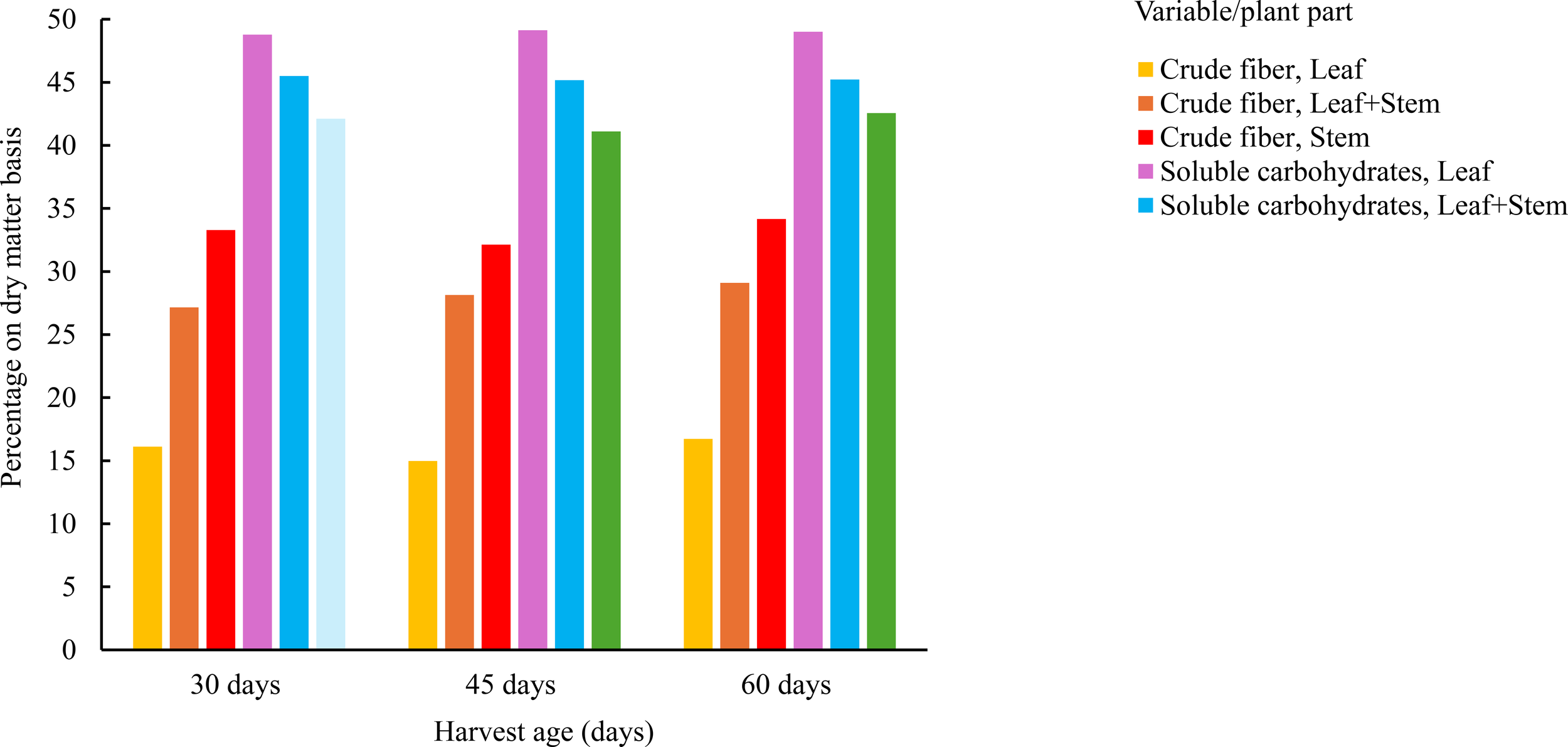 Average crude fiber and soluble carbohydrate content in Tithonia diversifolia by harvest age (30, 45, and 60 days) and plant part (Leaf, Stem, and Leaf + Stem).