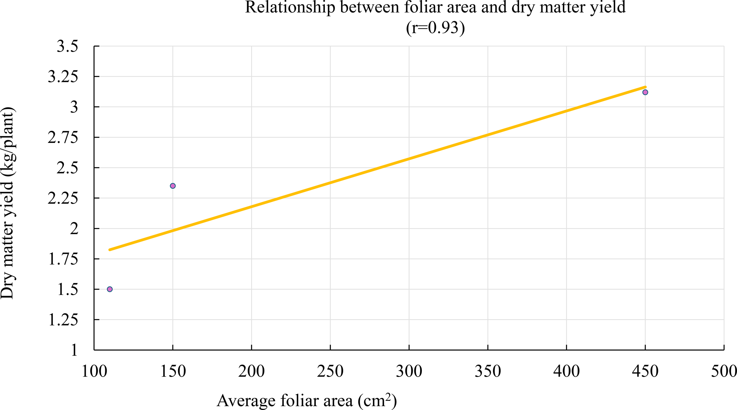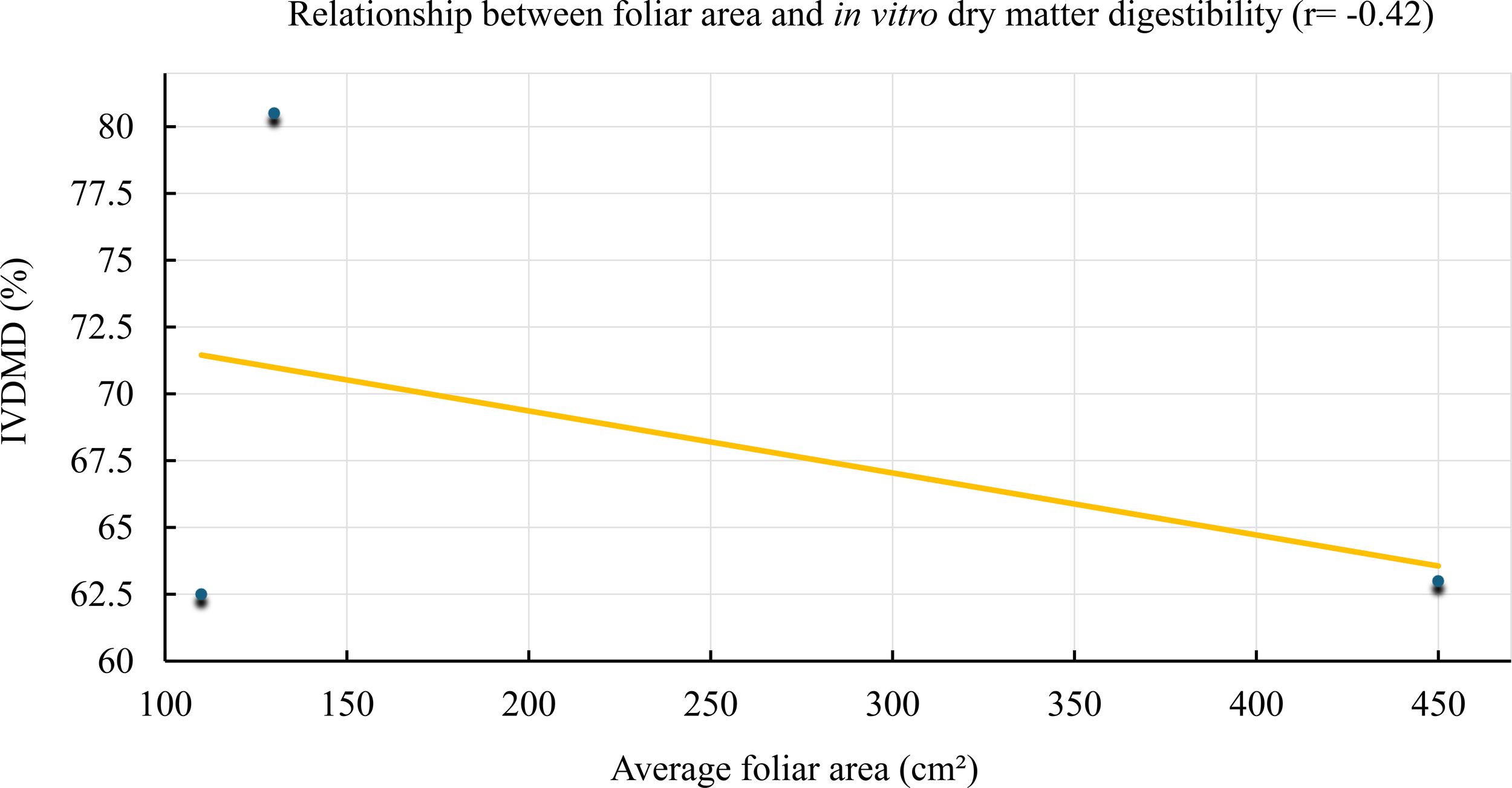 Biomass yield increased significantly with harvest age, reaching 11.93 kg fresh weight and 3.45 kg dry matter per plant at 60 days, although with reduced nutritional quality due to a higher stem proportion. Leaves harvested at 30 days had the highest crude protein (16.5%) and soluble carbohydrates (48.2%) with the lowest crude fiber (19.3%). In contrast, the 45-day leaf samples achieved the highest IVDMD (62.34 ± 1.42%). A strong positive correlation was observed between leaf area and biomass yield (r = 0.93), and a moderate negative correlation with digestibility (r = –0.42).