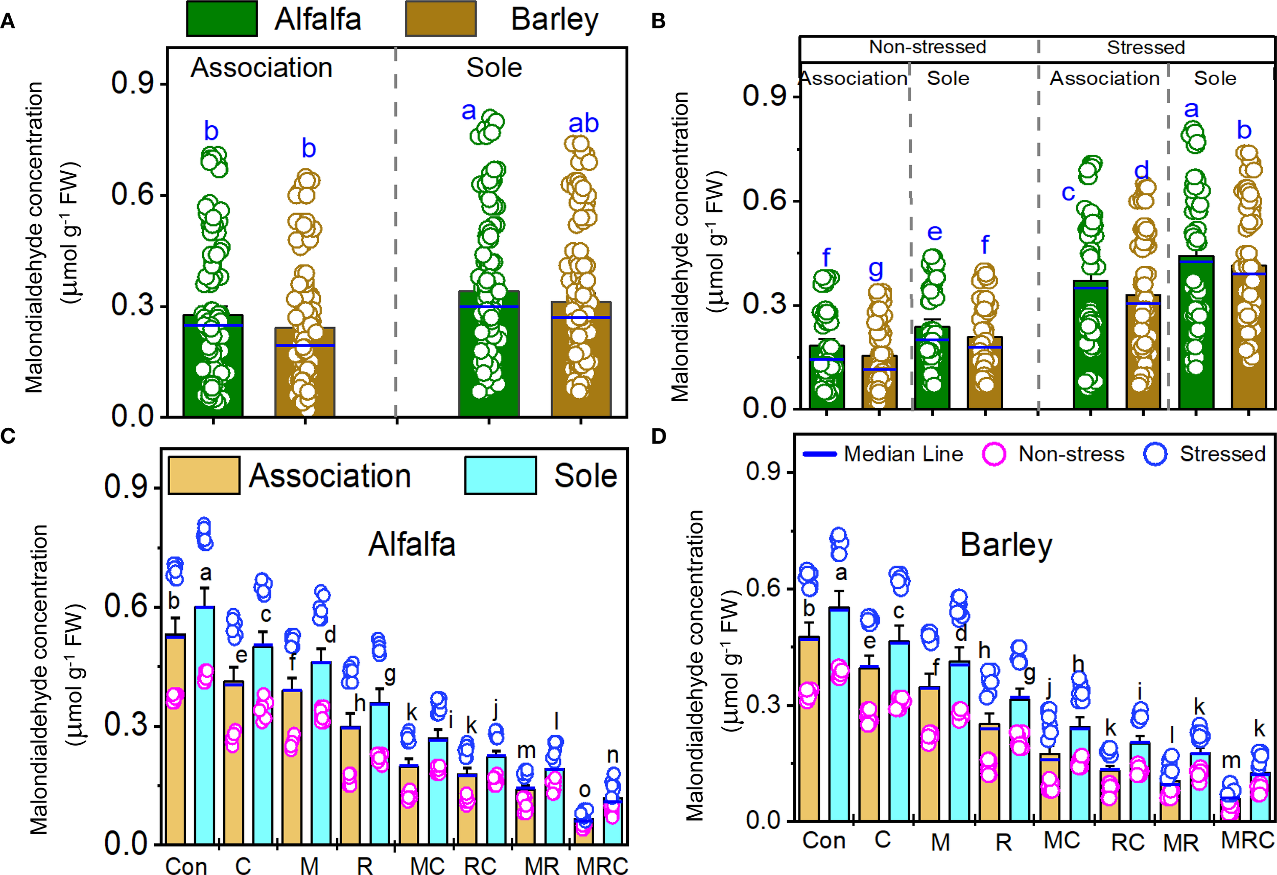 Assess how the association of alfalfa and barley alters the physiology of each crop compared to the sole crops of alfalfa or barley cropping practices, and in the presence or absence of inoculated microbes to mitigate drought and salinity stresses