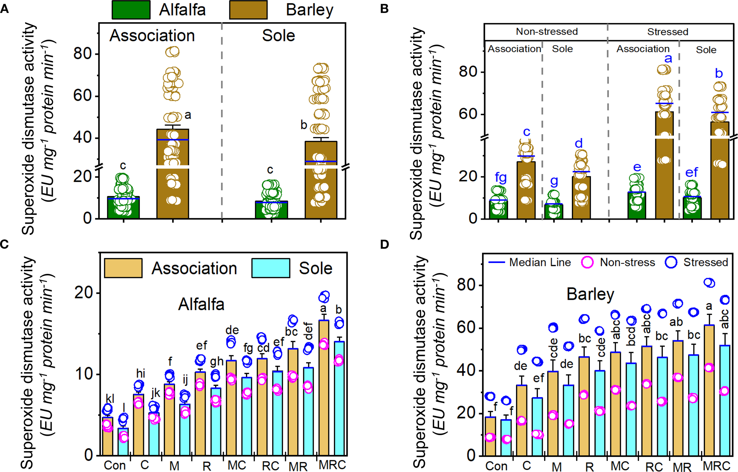 The results of the three-way ANOVA test for Ca, Es, Bt, and their interactions on shoot dry weight, H2O2, protein content, and CAT activity are shown in Table 2. The effects of Es and Bt were highly significant (p < 0.001) regarding the shoot dry weight, H2O2, protein content, and CAT activity (Table 2). The Ca effect was significant on the shoot dry weight, H2O2, and protein content, but not on the CAT activity. The tested interactions (Ca × Es, Ca × Bt, Es × Bt, and Ca × Es × Bt) were highly significant for H2O2. The interaction between Ca and Es was significant for shoot dry weight. We noted a significant interaction between Es and Bt on the shoot dry weight and protein content (Table 2). The shoot dry weight of alfalfa and barley in association with non-stressed conditions was higher than that of plants in sole pots under the different Bt conditions (Table 3). The MRC treatment of the stressed alfalfa and barley plants showed the highest shoot dry weight compared to stressed sole alfalfa and barley pots (Table 3). Stressed sole-planted barley plants exhibited higher H2O2 content under the control treatment than other biological treatments and associated plants (Table 3). The MRC and MR treatments demonstrated the lowest H2O2 contents compared to other treatments (Table 3). The protein content was highest in stressed alfalfa and barley grown together compared to non-stressed plants, as well as in sole alfalfa and barley, respectively. Barley exhibited a higher activity of CAT than alfalfa. The stressed alfalfa plants, in association, demonstrated higher activity of CAT than sole-planted plants. The MRC treatment showed the highest CAT activity in both alfalfa and barley plants.