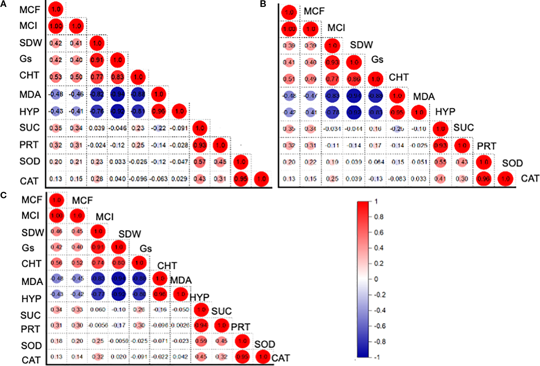 The effects of crop association (Ca), environmental stress (Es), biological treatments (Bt), and their interactions were examined through three-way, two-way, or one-way analyses of variance (ANOVA) using the General Linear Procedure (GLM) in JMP statistical software, version 14 (2022). The Least-Means/PDIFF option was used to separate means among Ca, Es, and Bt. This was carried out exclusively when the Student’s t-test from ANOVA was significant at p < 0.05. Levels of significance in Tables are given by ns (not significant, p ≥ 0.05); p < 0.05; **p < 0.01; ***p < 0.001. Correspondence analysis (CCA) was conducted to extract patterns of variation from the canonical axes and functional traits. The tests of significance for both canonical axes were carried out, and the p-values reported represent the significance determined by the Monte Carlo permutation with 499 permutations. A forward selection of the functional variables was implemented, and variables that significantly contributed to the axes are reposted on the biplots. The hierarchical heat map of the entire dataset, crop association, and sole cropping was computed using “phylo. makers” functions in the ‘phyr’ packages (RStudio Team, 2024). We considered the measured variable for the two years and each year separately. The table showing the correlation between pairs of functional variables was calculated and displayed.