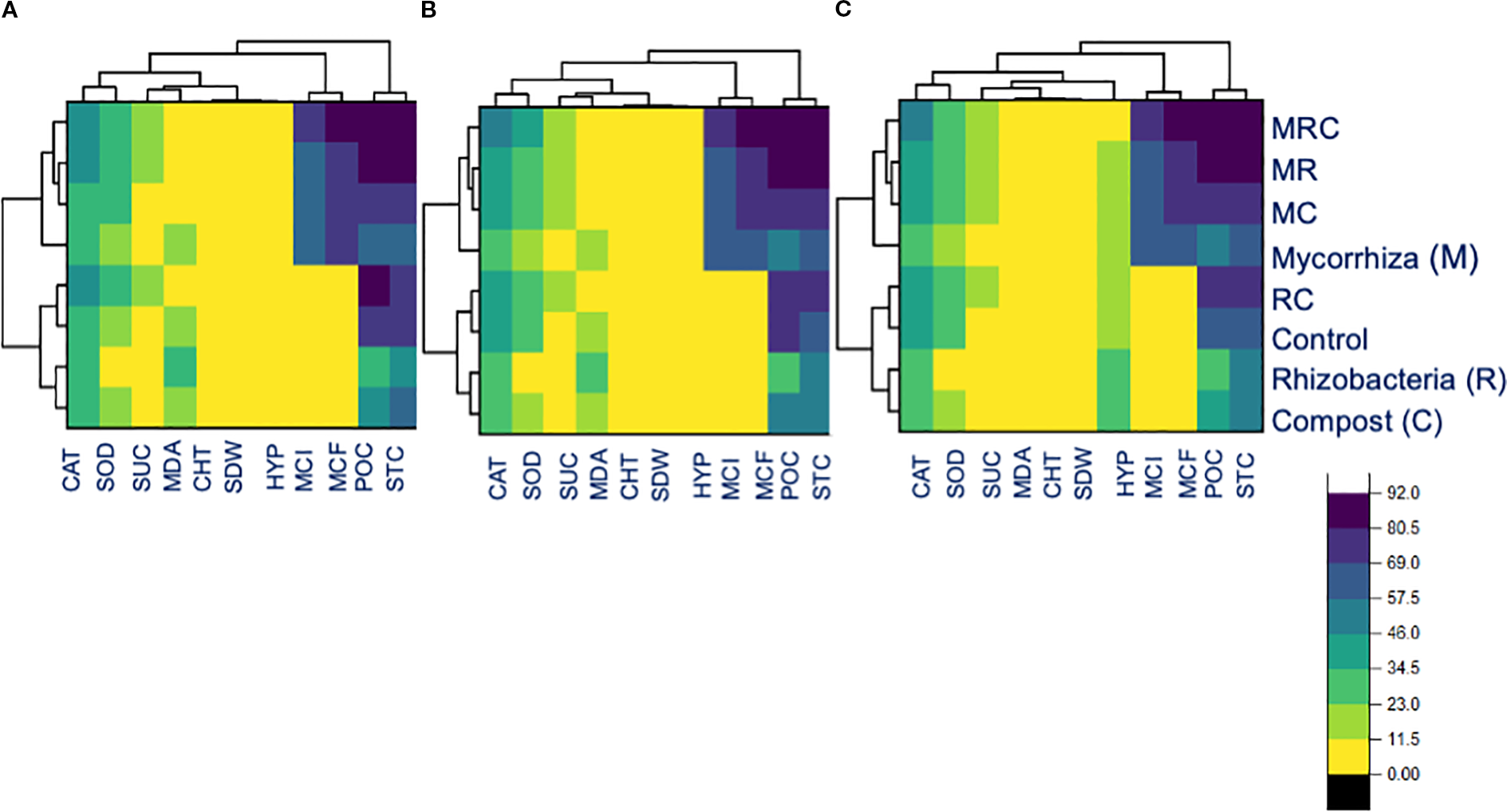 There is great interest in using ecologically acceptable and low-cost management interventions to tackle abiotic stresses that cause oxidative stress. The use of beneficial microbes and organic amendments to alleviate environmental stresses is gaining increased attention as a practical tool for enhancing crop growth and productivity. Organic amendments, such as compost, increase plant resilience by improving soil water retention, increasing soil organic matter, and enhancing nutrient availability, thereby improving crop growth and productivity (Ho et al., 2022). Additionally, plant growth-promoting microbes (PGPM), including arbuscular mycorrhizal fungi (AMF) and plant growth-promoting rhizobacteria (PGPR), play a crucial role in enhancing plant growth and resilience to environmental stress (Brokate et al., 2024; Panda and Das, 2024). AMF can assist plant growth by enhancing water absorption and mineral uptake, particularly from challenging-to-reach soil niches via their hyphal network (Slimani et al., 2024). PGPR plays a vital role in promoting plant growth by enhancing nutrient absorption through atmospheric di-nitrogen fixation, solubilizing essential nutrients such as phosphorus (P) and potassium (K), and chelating iron (Fe) via siderophores (Khoso et al., 2024). PGPR can also help plants manage abiotic stress by synthesizing aminocyclopropane-1-carboxylic acid (ACC) deaminase, which reduces ethylene levels and produces phytohormones such as indole acetic acid (IAA) and gibberellins. This process enhances the plant’s immune response and strengthens signal transduction, leading to optimal development (Khoso et al., 2024).