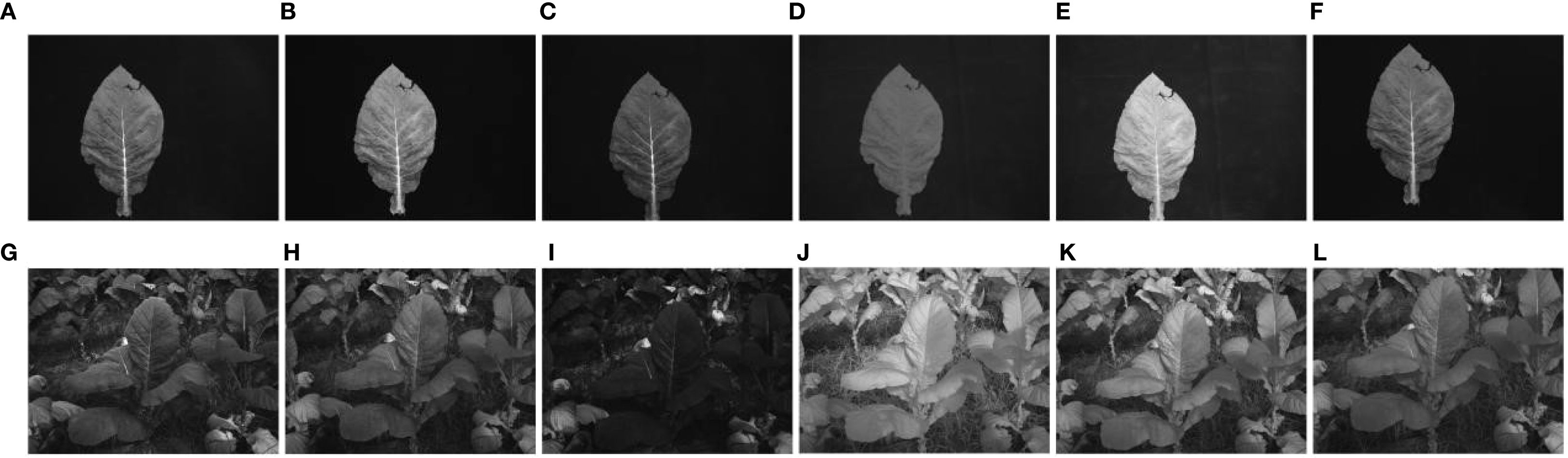 Figure 1. Multispectral images at leaf and canopy scales. (A–F) and (G–L) are tobacco leaf pictures in blue, green, red, red-edged, near-infrared and panchromatic bands, respectively.