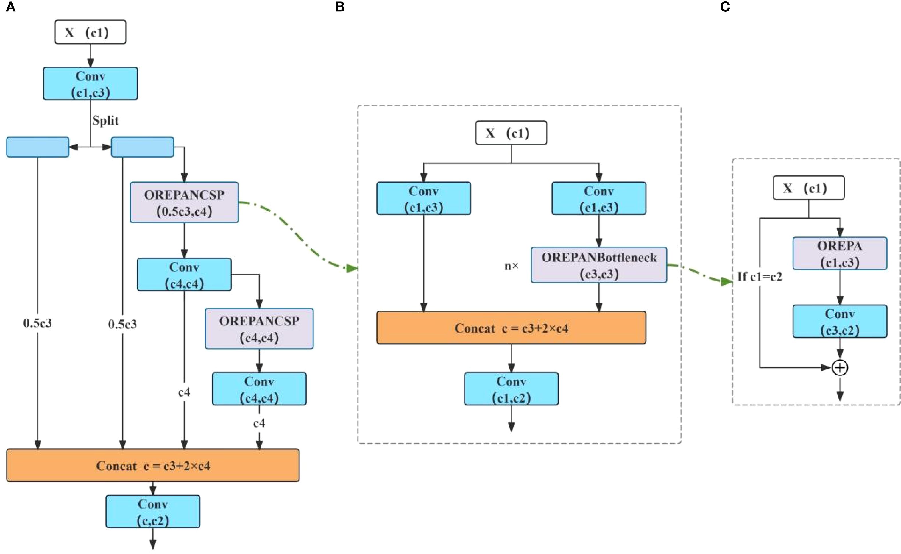 In addition, the GELAN (Wang et al., 2025) module, which integrates CSPNet (Wang et al., 2020) and ELAN (Wang et al., 2022), was used to replace the C2f module in the neck of YOLOv8. And then, the re-parameterized convolutional module OREPA was used to improve GELAN, naming the modified module OREPAGELAN. The integration of OREPA and GELAN enables multi-branch feature extraction during training and re-parameterization of the branches into a single convolutional block during inference. This design allows the model to learn diverse features across multiple scales and viewpoints while maintaining computational efficiency (Hu et al., 2022). Therefore, OREPAGELAN enhances the network’s expressive power without introducing significant complexity. The overall structure is shown in Figure 3. OREPA is a two-stage multi-branch reparameterized convolution module. The first stage, called the linearization stage, simplifies complex computational blocks by removing the nonlinear normalization layers and introducing a special linear scaling layer. The second stage, known as the block compression stage, compresses the already linearized blocks from the first stage and simplifies them into a single convolutional layer.