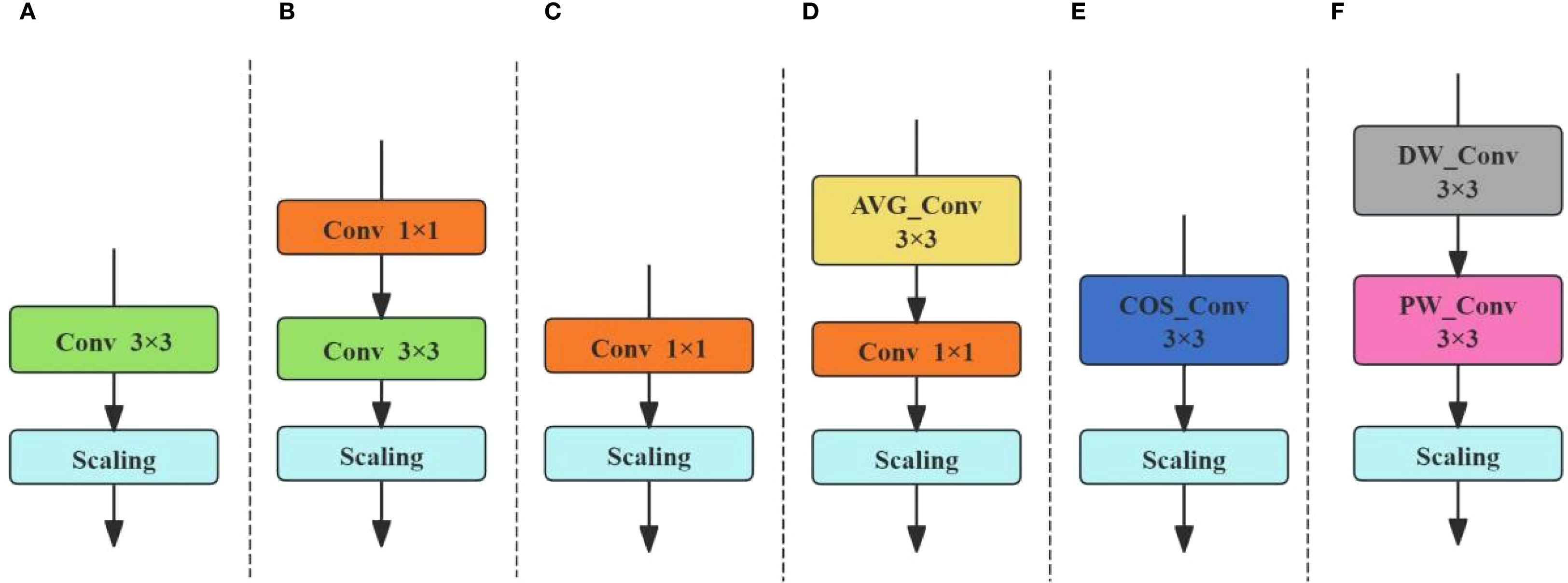 Figure 4. Six branches of OREPA. (A) 3×3 convolution block. (B) serial convolution block. (C) 1×1 serial convolution block. (D) mean convolution block. (E) cosine convolution block. (F) linear depth-separable convolution block.