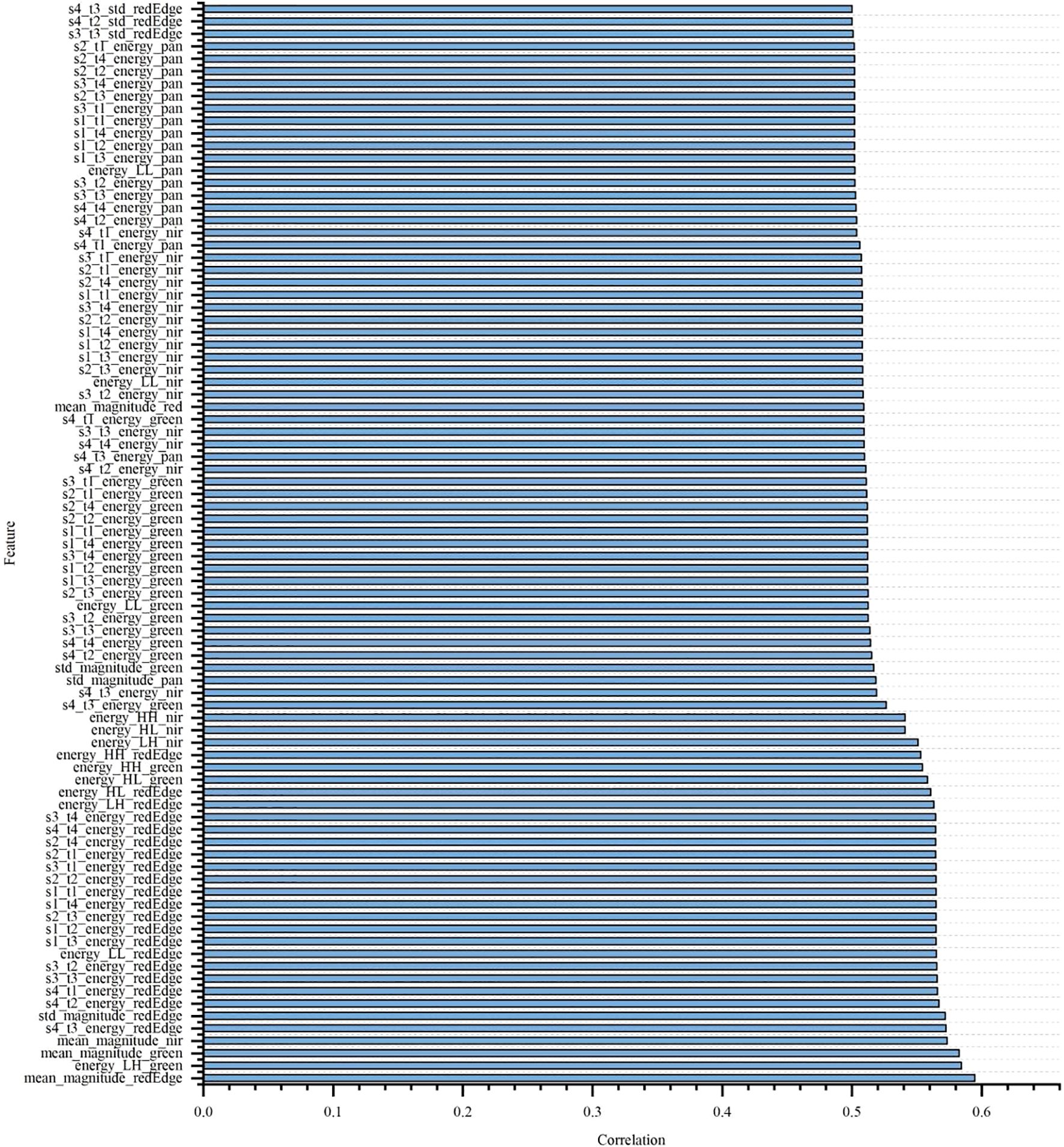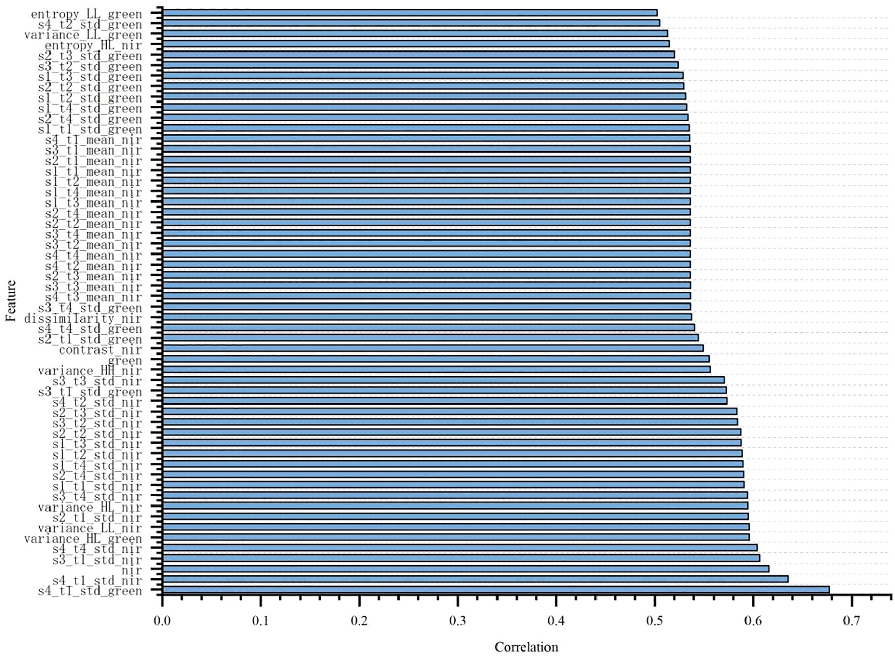 To explore the correlation between different spectral features and texture features with nitrogen and nicotine content, the Pearson correlation coefficient method was used to analyze the laboratory single tobacco leaves, as shown in Figures 6 and 7. Due to the large number of features, only those with Pearson correlation coefficients greater than 0.5 were presented. From the figures, it was evident that most texture features showed a significant correlation with total nitrogen and nicotine content. Additionally, in terms of spectral features, the correlation coefficients of the NIR and green bands with total nitrogen content were 0.618 and 0.557, respectively, indicating a strong correlation. The strong correlation of the NIR and green bands with total nitrogen content is due to two factors: (i) nitrogen influences chlorophyll concentration, which strongly absorbs blue and red light while reflecting green light, making the green band sensitive to nitrogen content; (ii) nitrogen affects leaf internal structure and water content, which primarily alter NIR reflectance, resulting in a high correlation between NIR bands and total nitrogen (Wang et al., 2021). However, no spectral features had a correlation coefficient greater than 0.5 with nicotine content.