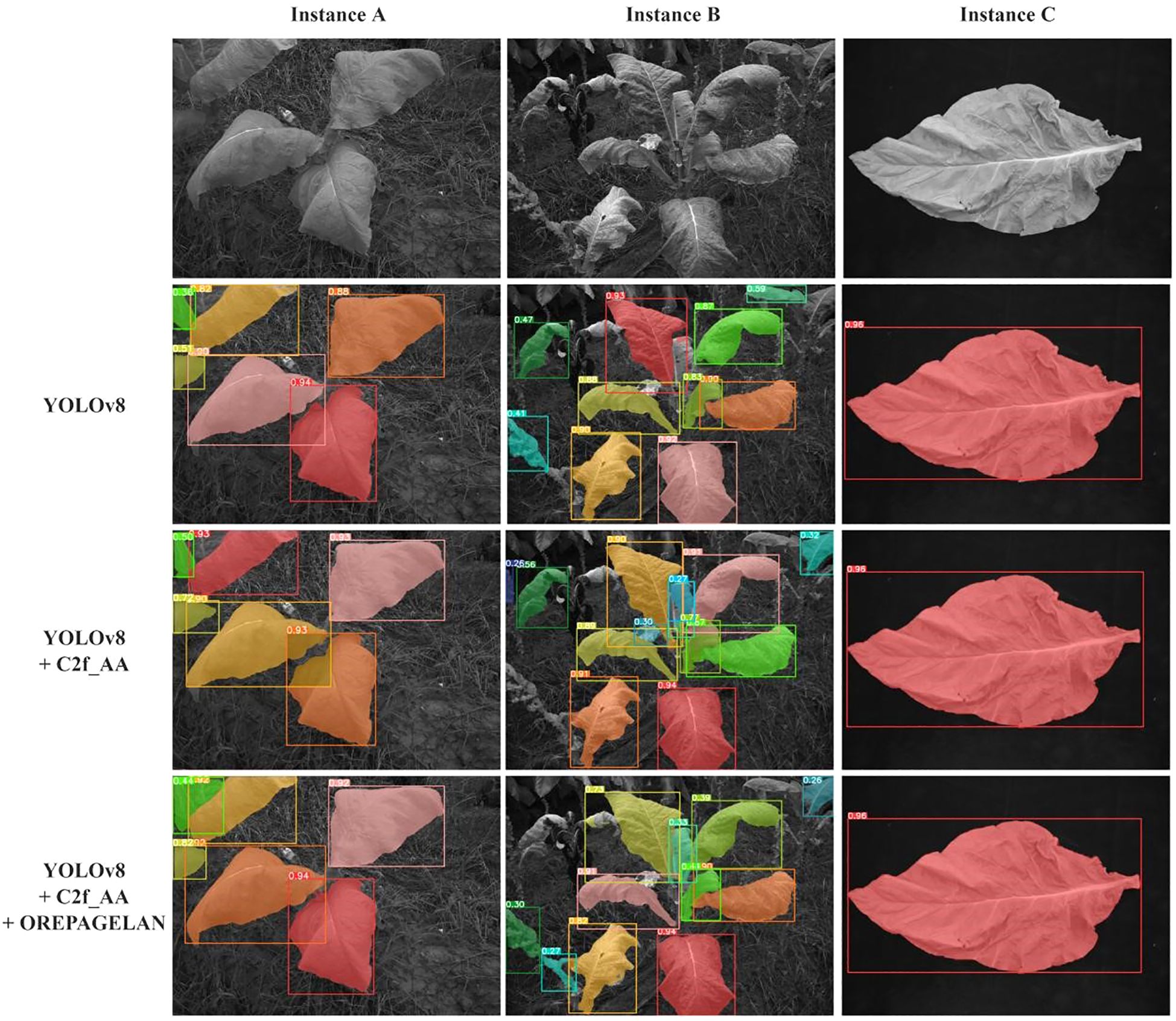 Figure 8 visually illustrates the effects of each improvement on multispectral tobacco leaf instance segmentation taken three scenes as examples. When segmenting instances A and B, the YOLOv8 model showed a tendency to miss small targets. After introducing the C2f_AA module, the model’s capability for detecting and segmenting small targets improved, with the improvement being more evident in instance B. However, overlapping segmentation masks between leaves still occurred. With the further integration of the OREPAGELAN module, the segmentation results for both instances A and B became more refined, enabling accurate detection and segmentation of small leaves while maintaining segmentation integrity and eliminating mask overlaps. For the segmentation of a single tobacco leaf in a controlled laboratory setting (Instance C), all three models achieved complete leaf segmentation.
