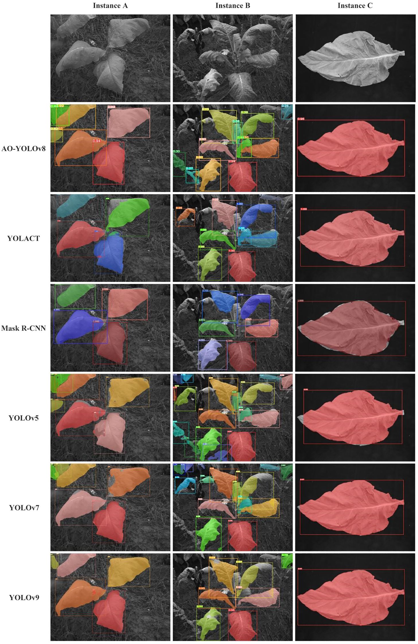 Figure 9 illustrates the segmentation results of various models. From the comparison of segmentation performance, it can be observed that for the relatively sparse tobacco plant instance A, AO-YOLOv8 effectively segmented each leaf without mask overlapping. In contrast, other models such as YOLOv7, YOLOv5, and YOLACT exhibited incomplete leaf segmentation, while YOLOv5 and YOLOv9 suffered from mask overlap or misidentification of small leaf regions as separate leaves. Mask R-CNN achieved relatively complete segmentation but failed to identify smaller leaves. For Example B, in the case of denser blades, AO-YOLOv8 can achieve relatively accurate segmentation, while other models have problems such as incomplete recognition, mask overlap and missed targets. In the case of instance C, AO-YOLOv8 achieved complete segmentation, whereas other models showed incomplete segmentation at leaf tips, tails, and edges. These results demonstrated that the integration of C2f_AA and OREPAGELAN enhanced the model’s ability to extract tobacco leaf features in field environments, effectively distinguishing leaf boundaries and overlapping regions, thereby achieving higher segmentation accuracy.