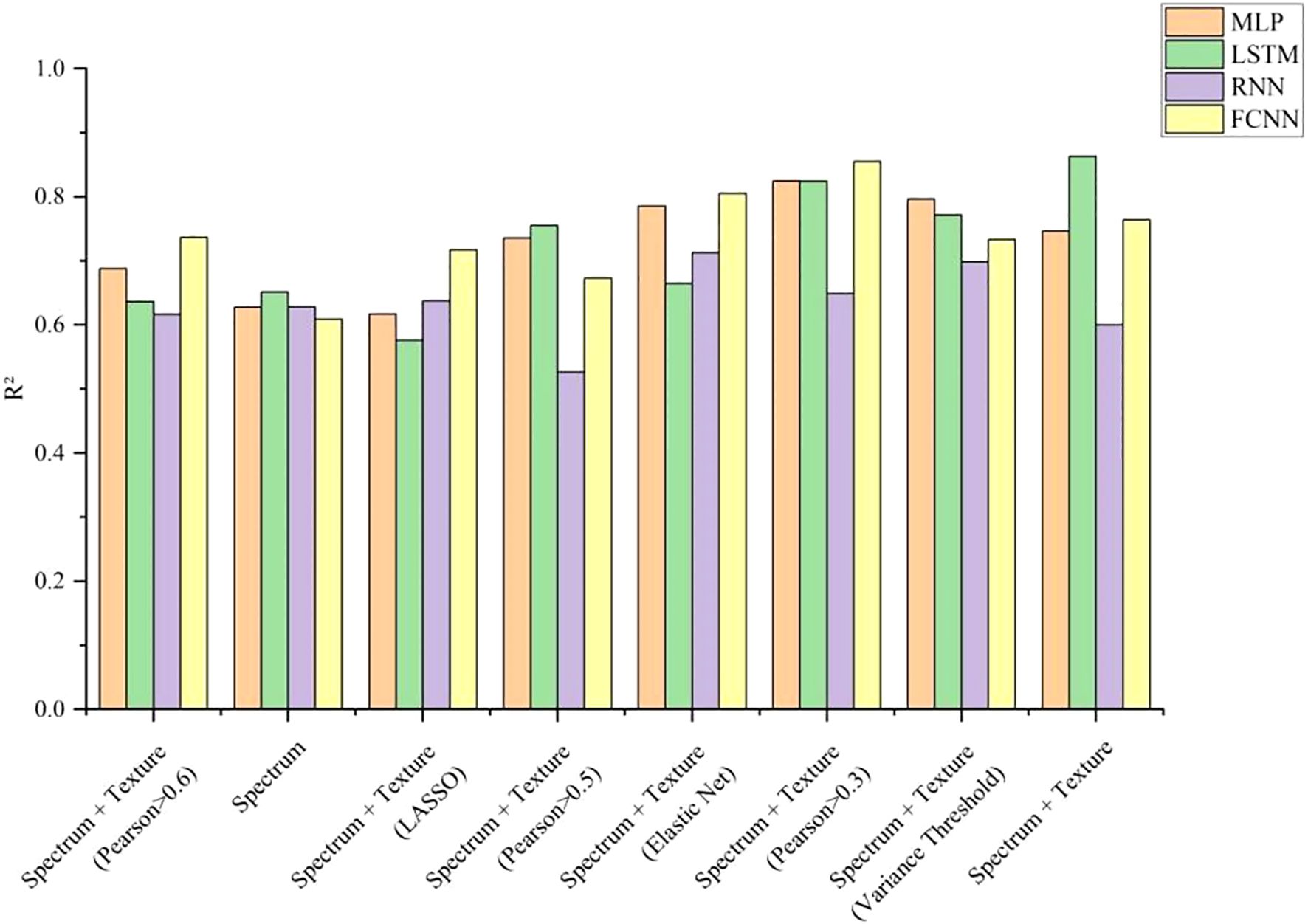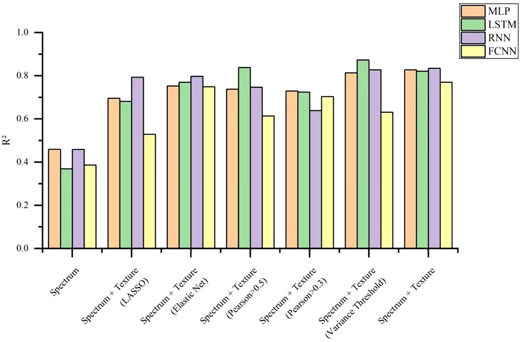The results of nicotine content prediction are shown in Table 7, where texture features have a more significant impact on the accuracy of prediction. The MLP, RNN, and FCNN models all achieved the highest R² when using both spectral and texture data, with R² of 0.8278, 0.8343, and 0.7704, respectively. After applying variance threshold filtering to the spectral and texture data, the LSTM model achieved the highest prediction accuracy for nicotine content, with an R² of 0.8735. Figure 13 visually illustrates the R ² of nicotine prediction under different datasets. Figure 14 shows the fitting effect of four models on the true and predicted values in the dataset with the highest R ².