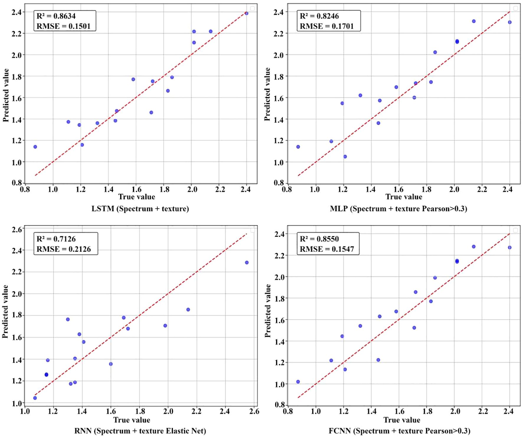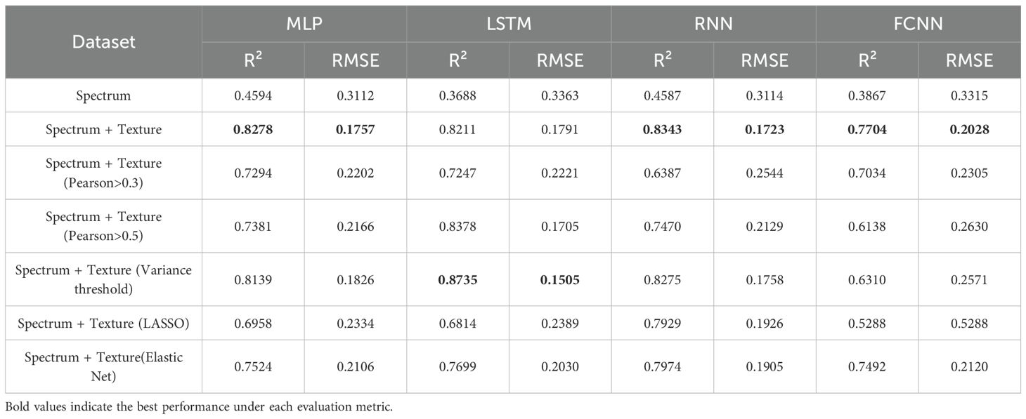 In this experiment, four deep neural network models, namely Long Short-Term Memory Network (LSTM), Recurrent Neural Network (RNN), multi-layer Perceptron (MLP), and Fully Connected Neural Network (FCNN), were adopted to predict the total nitrogen and nicotine content of tobacco leaves. (i)RNN aims to utilize its sequence processing capability to mine the spatial ordered correlation of texture features; (ii)LSTM overcomes the memory limitations of RNN in long sequences through its unique gate system and better captures complex texture relationships; (iii)MLP is used as a simple and universal benchmark model to handle fixed-dimensional inputs; (iv)FCNN focuses on high-dimensional feature fusion and end-to-end prediction, effectively combining multi-source information such as spectra and textures.