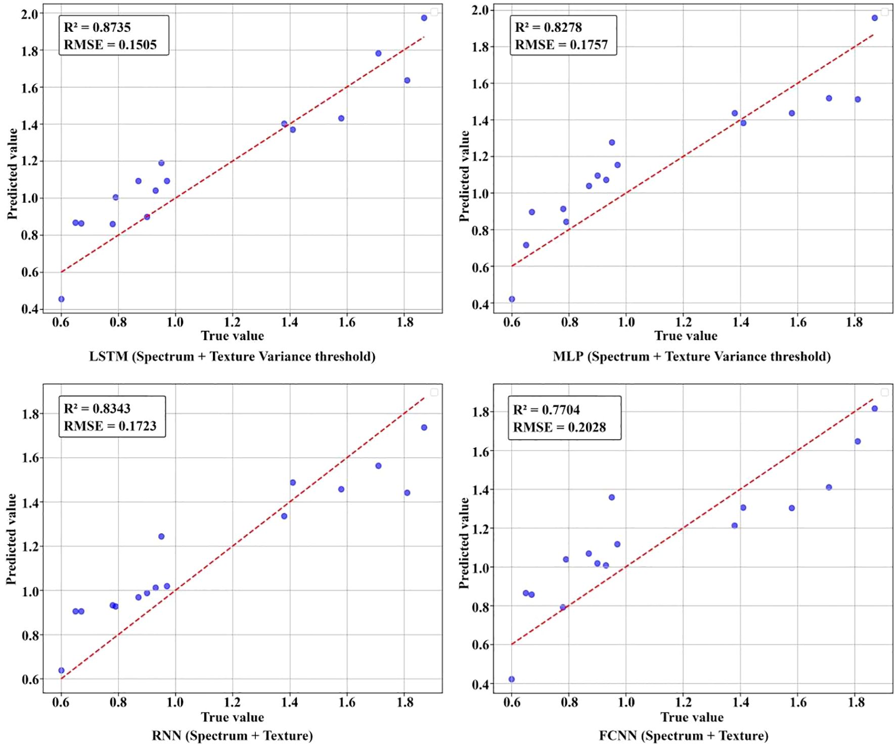 Compared with traditional spectral analysis methods, this study has achieved innovative breakthroughs in two dimensions: data processing and model construction: (i) Effectively compensating for the deficiency of spectral information through texture parameters. (ii) Four deep learning architectures such as LSTM were introduced. The nonlinear activation function among them can capture the complex interaction between spectral reflectance and texture features, thereby improving the accuracy of the final prediction.