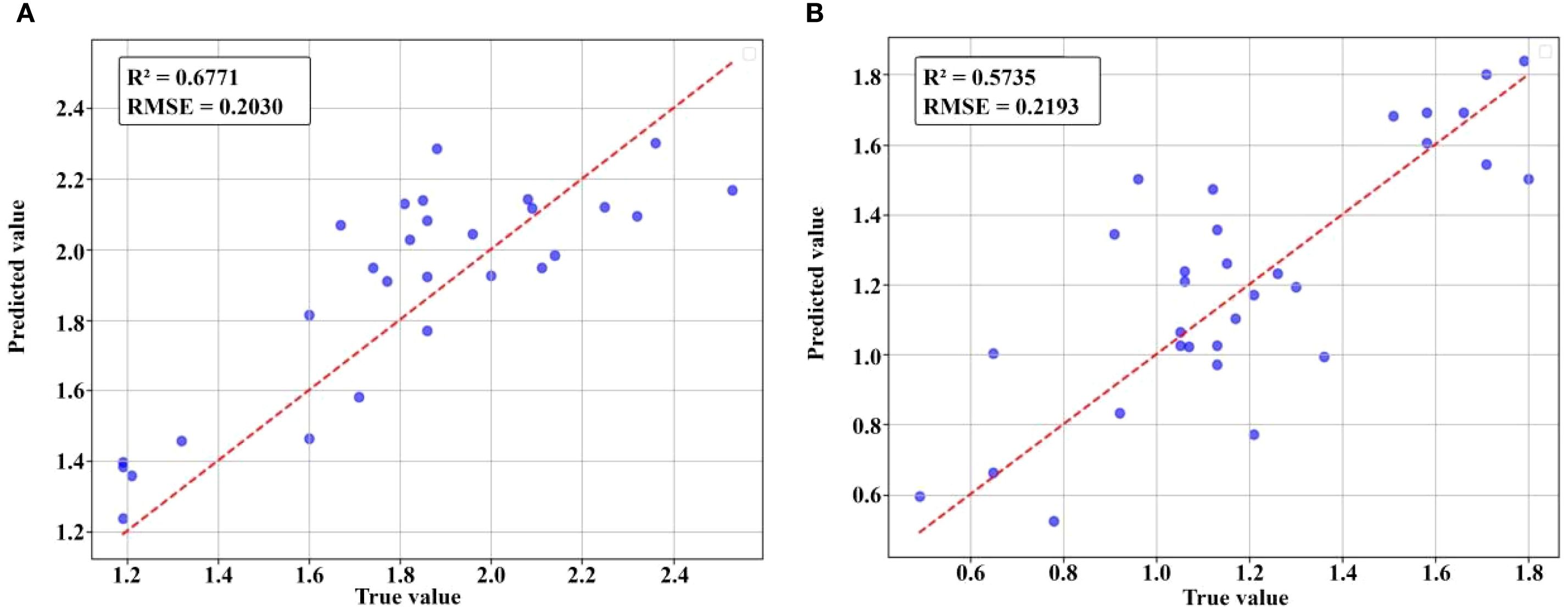 Under laboratory conditions, the fused dataset of spectral and texture features achieved high prediction accuracy (R² = 0.8634 for nitrogen, R² = 0.8735 for nicotine), showing clear advantages compared with methods based solely on spectral features for estimating total nitrogen (R² = 0.73) (Guo et al., 2023) and nicotine (R² = 0.797) (Tian et al., 2025). This confirms that, in addition to spectral features, the structural information of leaf surfaces expressed by texture features (such as veins, roughness, and uniformity) can serve as an effective supplement, providing a more comprehensive characterization of tobacco leaves. However, when extended to field validation, the performance decreased (R² = 0.6771 for nitrogen, R² = 0.5735 for nicotine). This decline can be explained by three factors: (i) shadow interference from overlapping leaves affecting spectral acquisition; (ii) the curved and drooping morphology of field-grown leaves reducing texture reliability; and (iii) residual segmentation errors introducing local noise. Such discrepancies between laboratory and field results are consistent with previous remote sensing studies, where canopy complexity and occlusion were shown to constrain model generalization. Comparative analysis revealed that this discrepancy primarily originated from three environmental factors: first, shadow interference caused by mutual leaf occlusion in the field directly affected the accuracy of spectral acquisition; second, compared to the full-view observation of flat leaf samples in laboratory settings, the curved and drooping morphology of tobacco leaves under natural growth conditions led to difficulties in texture feature extraction. Finally, although leaf segmentation was applied, overlapping leaves and slight segmentation inaccuracies in the field could still introduce local feature errors.