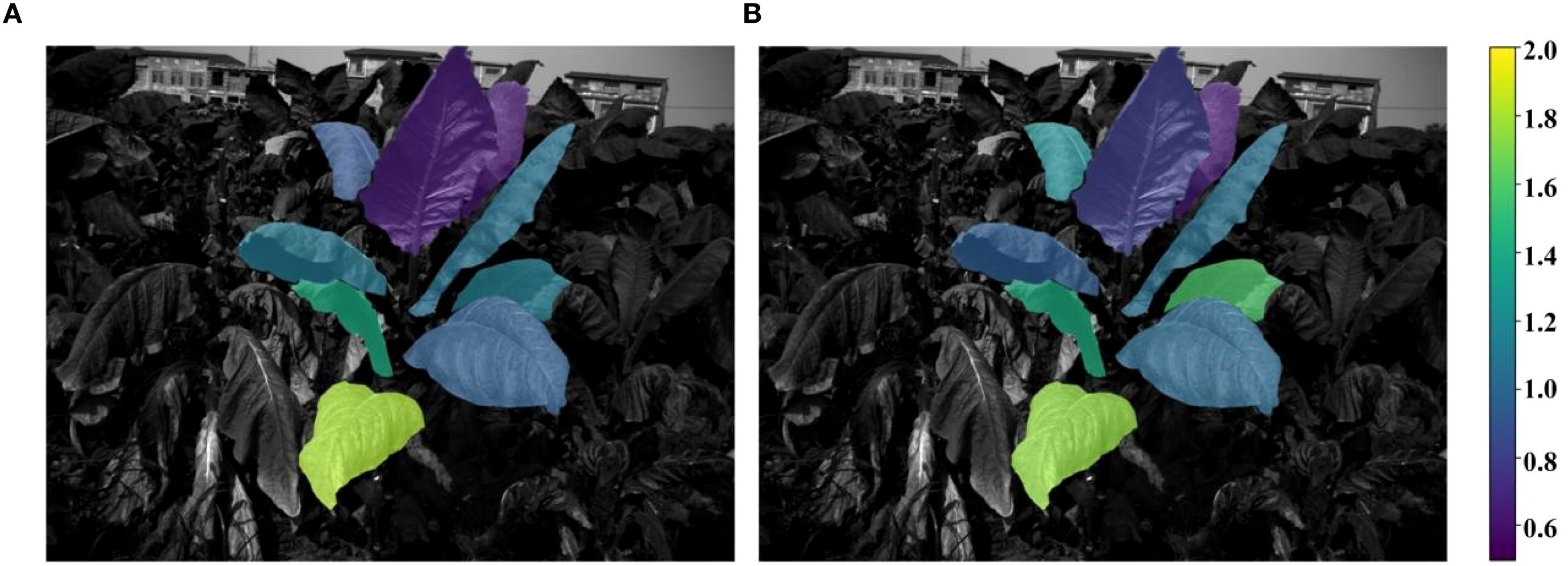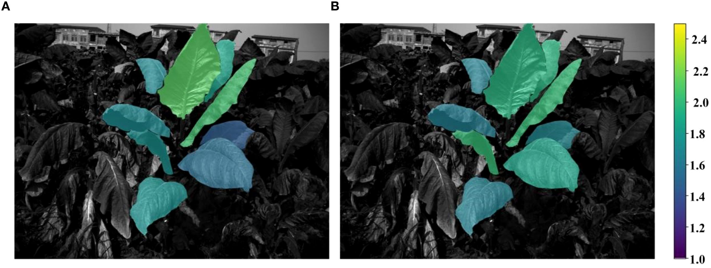 Current methods are generally limited to canopy-level observations and lack the capacity to capture biochemical information from the middle and lower leaf positions. To obtain the biochemical information of the middle and lower leaves, the segmentation of the leaves is the first problem to be solved. Liu et al. (2020) applied the YOLOv3 and YOLOv3_tiny to detect the maize crops and performed better than traditional image segmentation methods. A two-stage soybean leaf segmentation model based on leaf localization and guided segmentation achieved high accuracy (AP=0.976, AR=0.981), effectively handling overlapping leaves (Wang et al., 2023). YOLOv8-seg has been enhanced with Ghost and BiFPN modules, reaching a Dice score of 86.4% on the CVPPP Leaf Segmentation Challenge, especially improving small leaf segmentation (Wang et al., 2024b). For tobacco, improvements to MASK RCNN with feature fusion and hybrid attention achieved Avg.MIoU of 85.10% and Avg.MPA of 84.94%, and the Segment Anything Model (SAM) demonstrated robust segmentation across growth stages (Zhang et al., 2023). These studies highlight the effectiveness of deep learning for high-precision leaf segmentation under complex conditions. However, these studies are all based on RGB images, and research on leaf segmentation using multispectral grayscale images remains limited. Therefore, this study proposes an instance segmentation algorithm specifically for multispectral images, aiming to accurately separate individual leaves and improve the estimation accuracy of leaf-related traits.