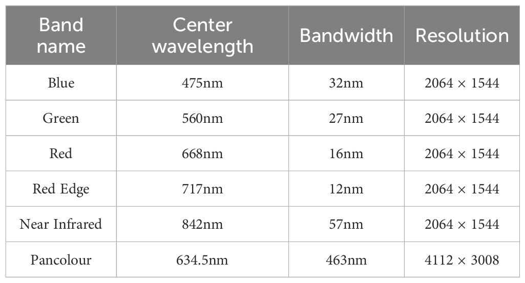The MicaSense Altum-PT multispectral camera was used for image capture. The camera has a total of 6 multispectral lenses, and a single capture can obtain images with six different spectral bands, as shown in Table 1.
