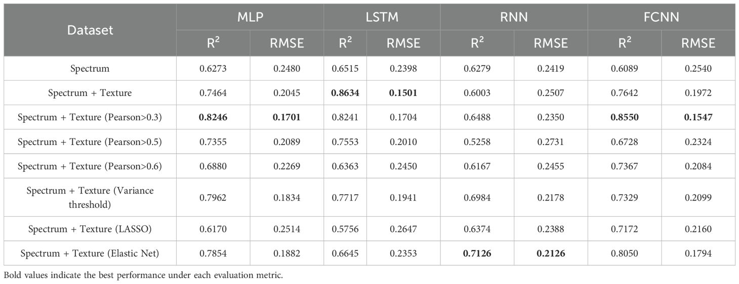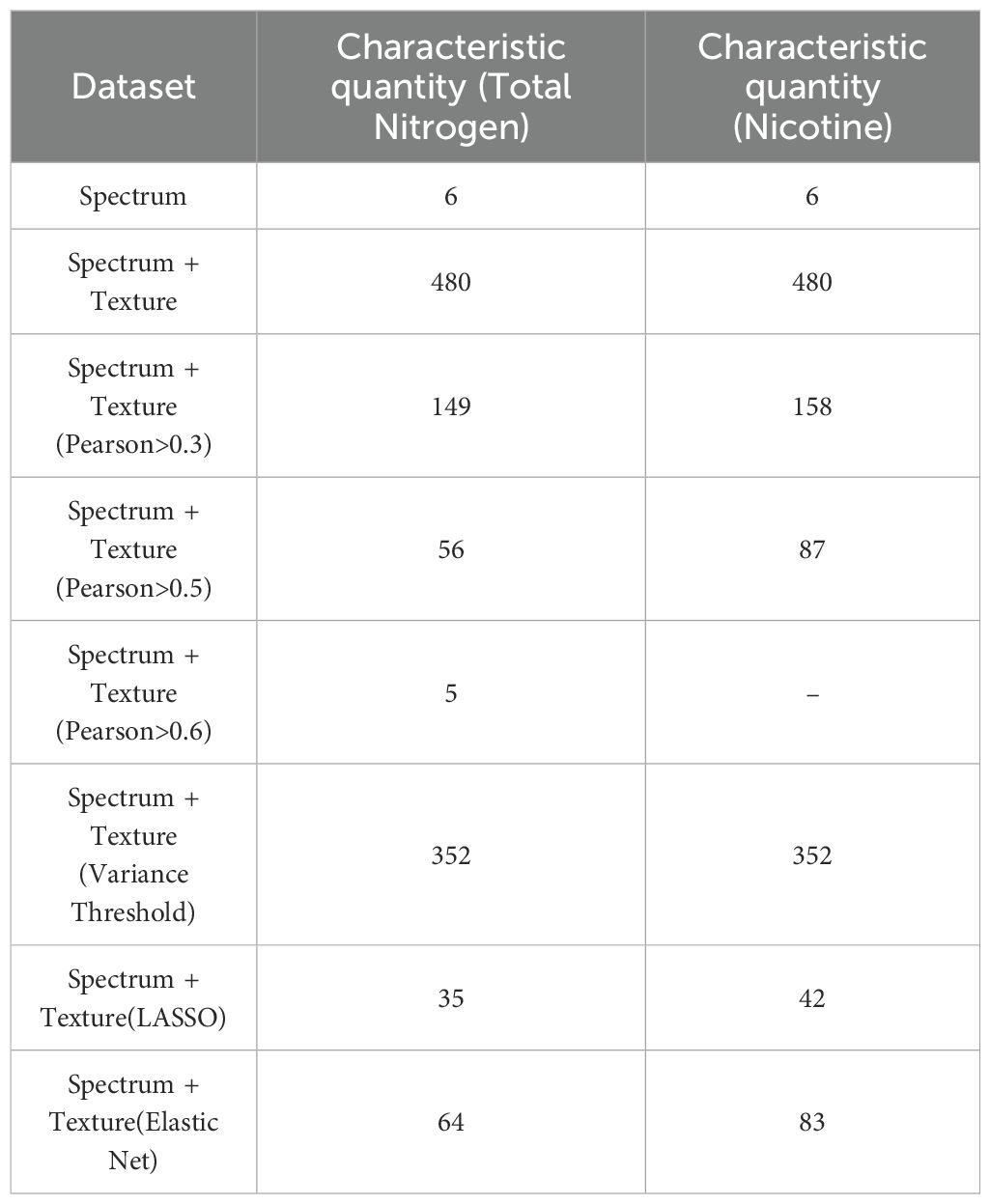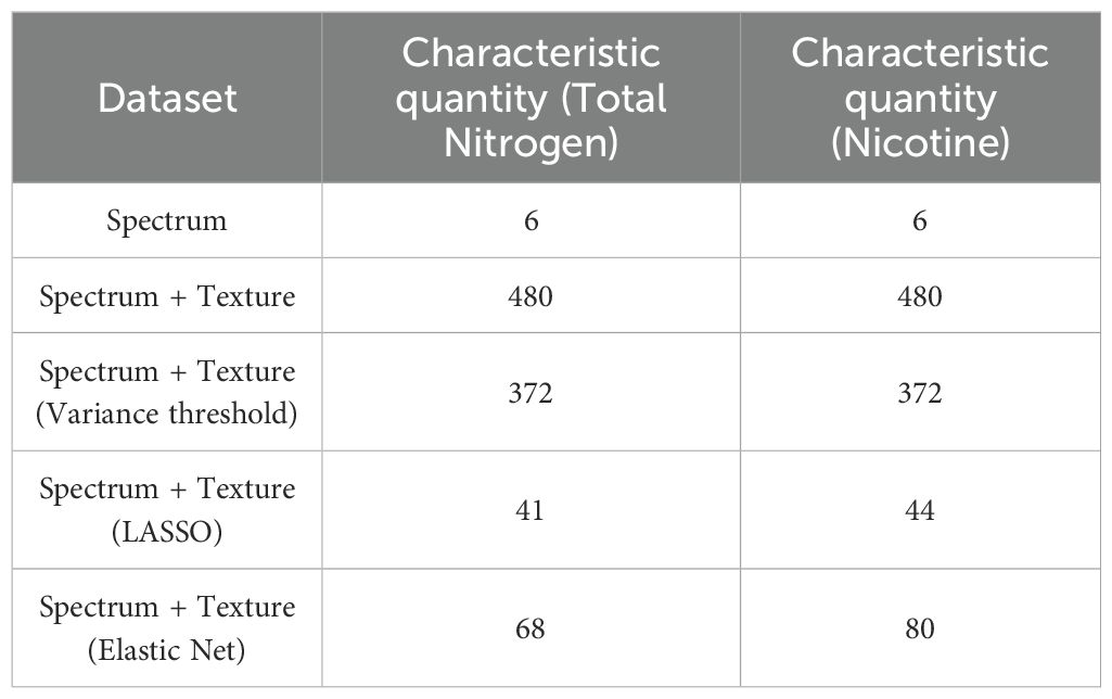 The initial extraction yielded 480 features (474 texture + 6 spectral), feature screening was necessary to reduce computational redundancy and highlight the most informative descriptors for nitrogen and nicotine prediction. Four representative methods were employed: (i) Pearson correlation threshold (0.3, 0.5, 0.6) to retain features with higher correlation to nitrogen or nicotine, (ii) variance threshold to exclude features with little variation, (iii) LASSO, which uses L1 regularization to shrink irrelevant feature weights to zero, and (iv) Elastic Net, which combines L1 and L2 regularization to robustly select among correlated features. The resulting subsets (Tables 2, 3) ensured that subsequent deep learning models could focus on the most relevant features, improving efficiency and generalization.