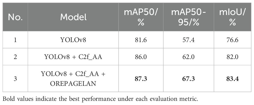 YOLOv8 achieved 81.6%, 57.4% and 76.6% in mAP50, MAP50–95 and mIoU, respectively. On this basis, after the introduction of C2f_AA, the model had a significant improvement in all evaluation indexes, mAP50 increased to 86.0%, MAP50–95 increased to 62.0%, mIoU increased to 82.0%, indicating that the improvement enhances the model’s ability to detect and segment target instances. After the further introduction of OREPAGELAN, the model performance was further optimized, among which mAP50 increased to 87.3%, MAP50–95 increased to 67.3%, mIoU increased to 83.4%, and the three indexes increased by 6.99%, 17.25% and 8.88% respectively. These results validated the effectiveness of the proposed method in the case segmentation task.