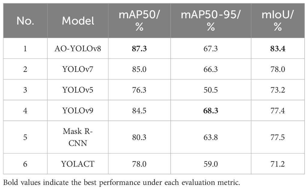 Furthermore, this study conducted comparative experiments between AO-YOLOv8 and other YOLO-series models (YOLOv5, YOLOv7, and YOLOv9), as well as classical instance segmentation models, including Mask R-CNN and YOLACT. All experiments were performed under the same experimental conditions. The results of each model are presented in Table 5. As shown in the results, AO-YOLOv8 outperformed all other models in terms of mAP50 and mIoU, while also achieving a relatively high performance in mAP50-95. These findings indicated that the proposed method can more effectively perform instance segmentation and demonstrated superior generalization ability and robustness compared to several mainstream approaches.