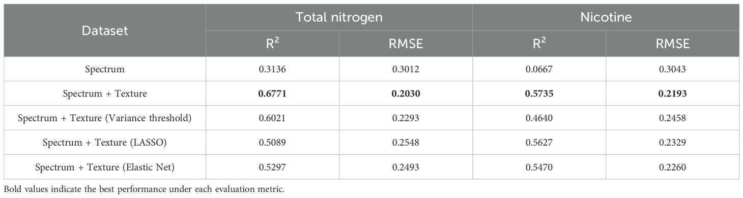 In terms of chemical composition estimation methods, traditional determination of total nitrogen and nicotine in tobacco relies on destructive laboratory analyses, which, although accurate, are time-consuming and unsuitable for large-scale monitoring. Hyperspectral or multispectral imaging enables rapid and non-destructive detection (Guo et al., 2023; Tian et al., 2025). In this study, both spectral and texture features were combined to estimate total nitrogen and nicotine. The results demonstrated that texture features played an important complementary role in chemical composition estimation, which is consistent with the findings of Yang et al (Yang et al., 2025).
