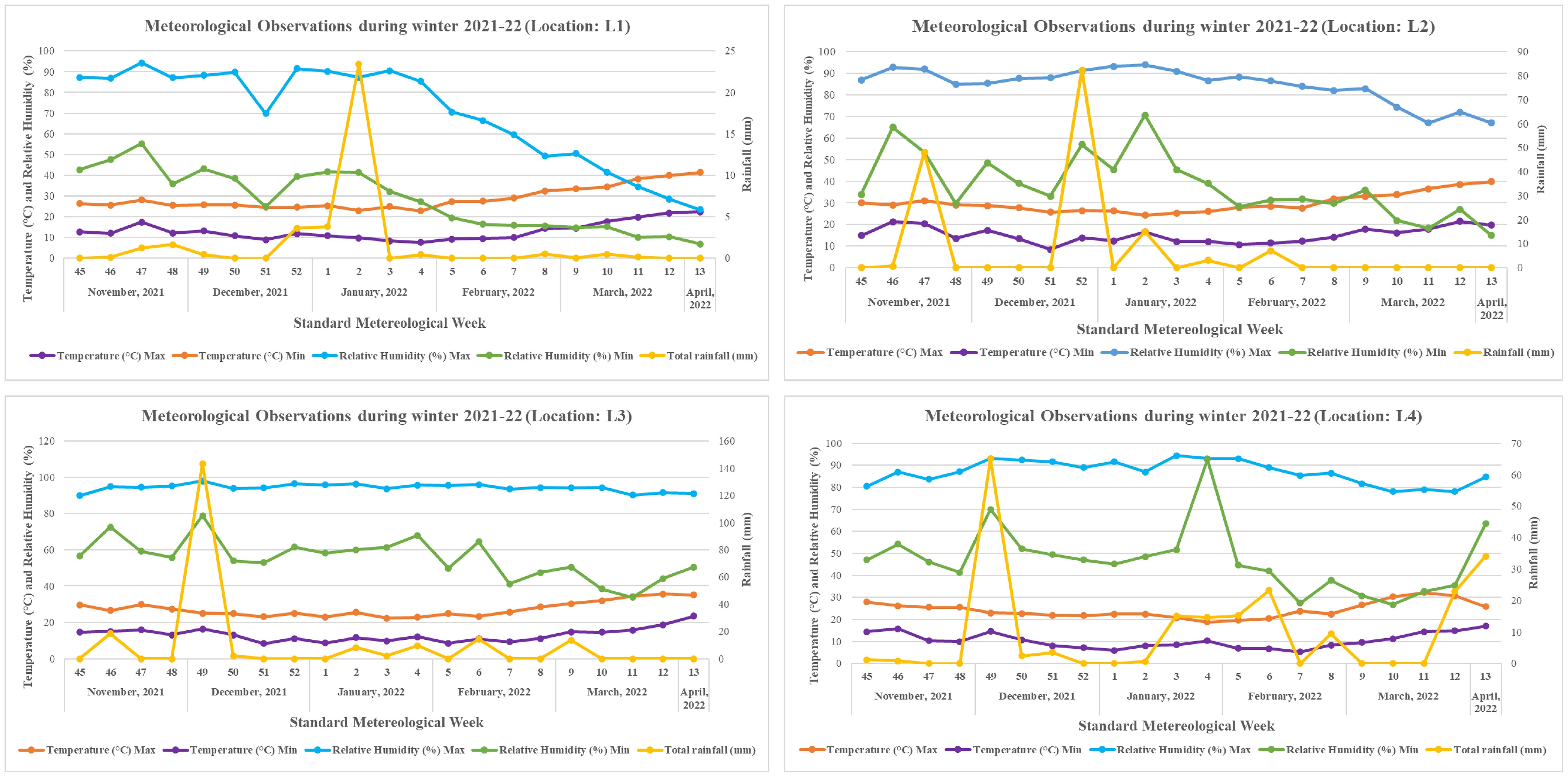 Four line graphs display meteorological observations during winter 2021-22 at Locations L1, L2, L3, and L4. Each graph shows temperature (°C) max and min, relative humidity (%) max and min, and total rainfall (mm) over standard meteorological weeks from November 2021 to April 2022. Key trends include a noticeable spike in rainfall and fluctuations in humidity and temperature across all locations.