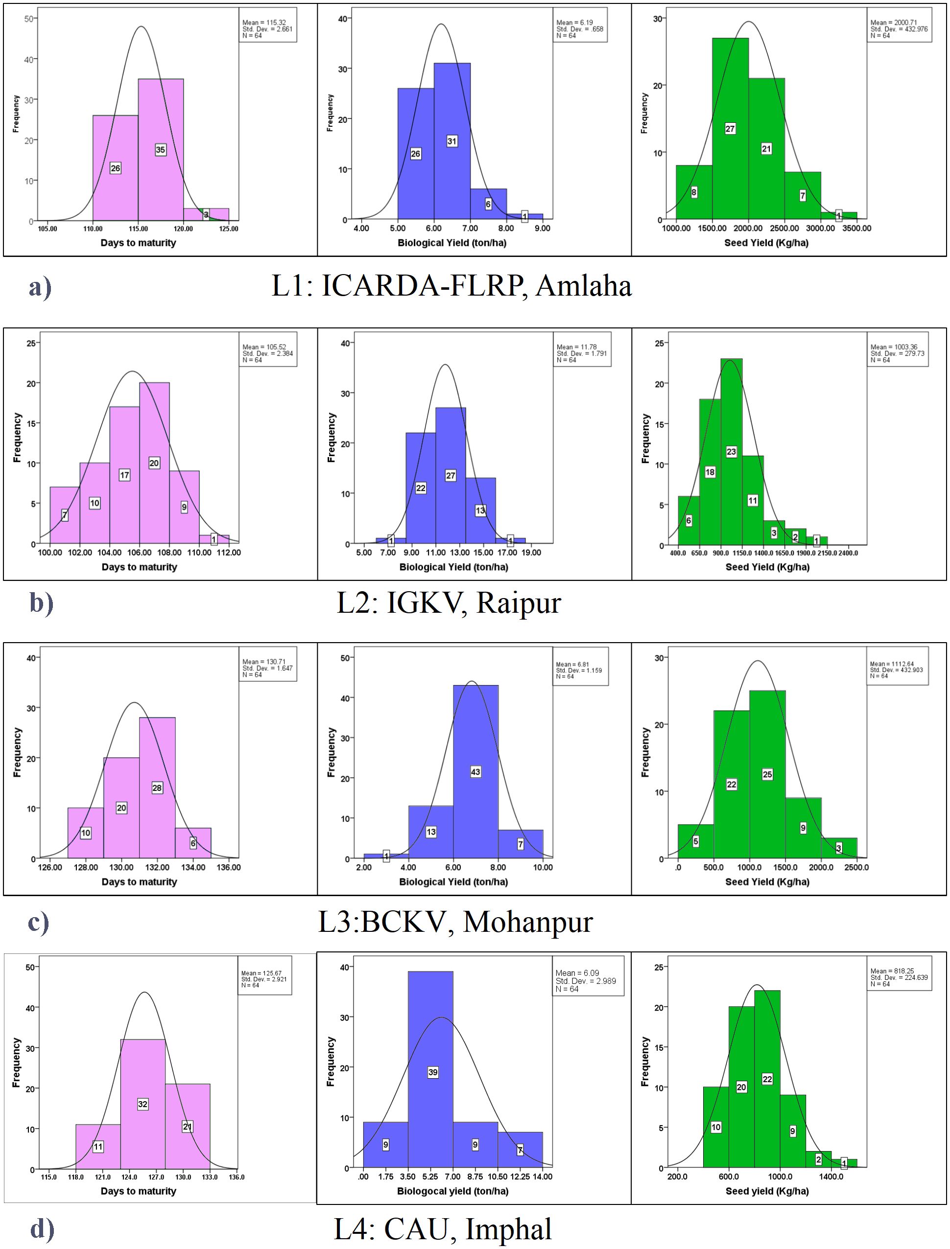 Figure 3. Frequency distribution of yield-attributing traits (days to maturity, biological yield: t/ha; seed yield: kg/ha) in grasspea genotypes over the locations. (a) Frequency distribution of yield-attributing traits in grasspea genotypes at ICARDA-FLRP, Amlaha. (b) Frequency distribution of yield-attributing traits in grasspea genotypes at IGKV, Raipur. (c) Frequency distribution of yield-attributing traits in grasspea genotypes at BCKV, Mohanpur. (d) Frequency distribution of yield-attributing traits in grasspea genotypes CAU, Imphal.