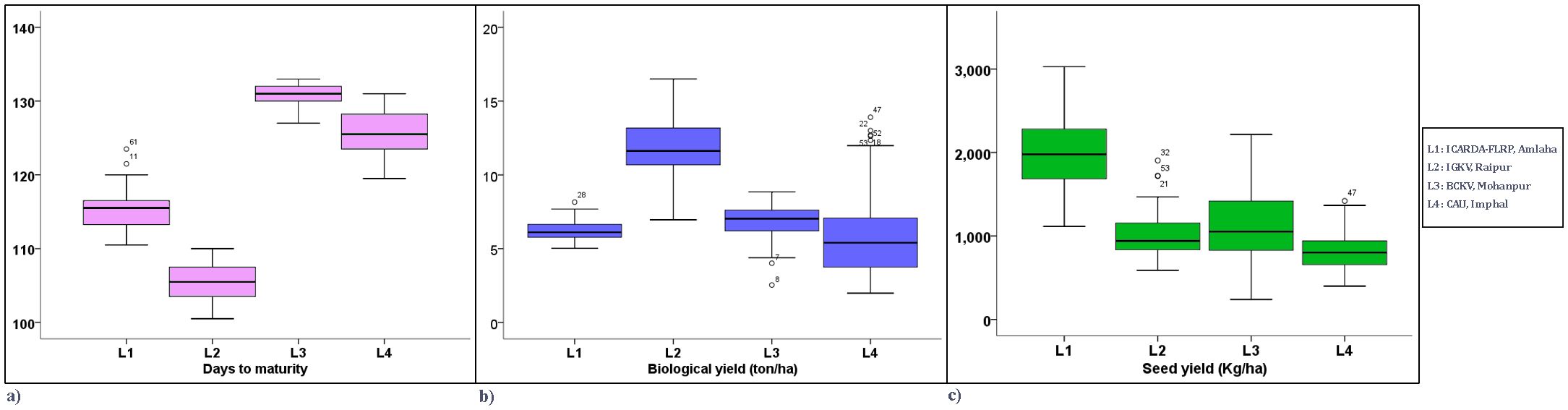 Figure 4. Boxplot view of yield-attributing traits of the grasspea genotypes over the locations. (a) Boxplot view of days to maturity of the grasspea genotypes over the locations. (b) Boxplot view of biological yield (t/ha) of the grasspea genotypes over the locations. (c) Boxplot view of seed yield (kg/ha) of the grasspea genotypes over the locations.