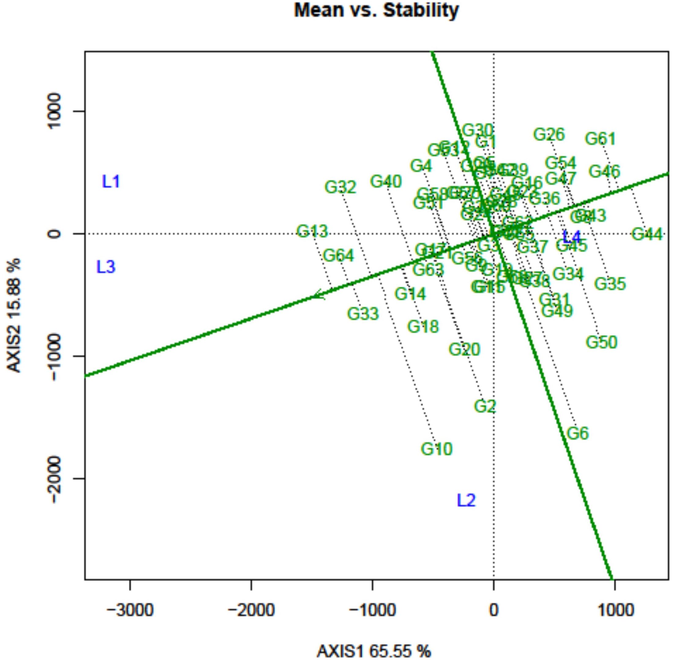 Biplot titled “Mean vs. Stability” with Axis1 and Axis2 labeled as 65.55% and 15.88% respectively. Points labeled G1 to G64 are plotted, showing their distribution. Lines L1, L2, and L3 indicate directions.