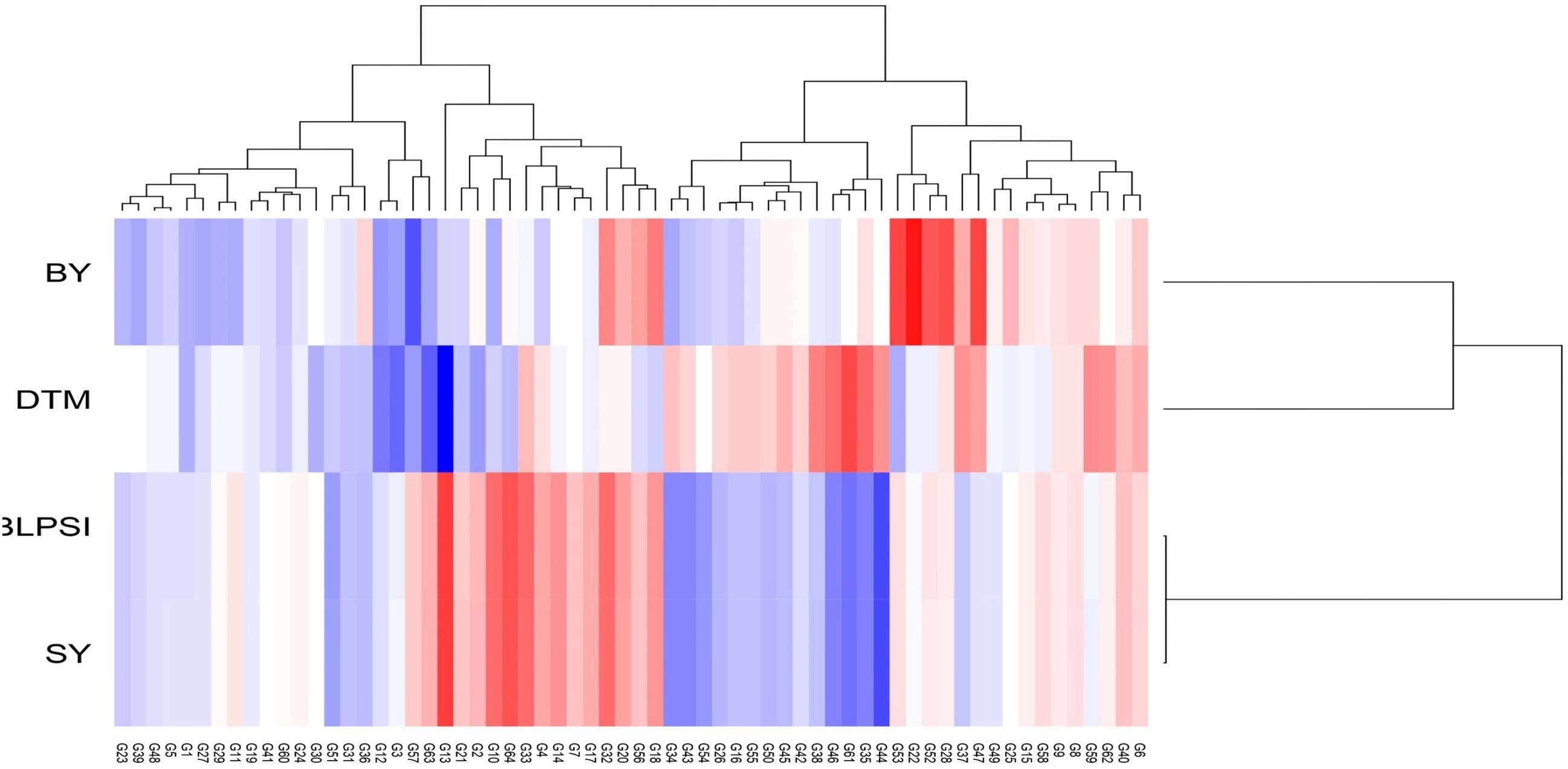 Heatmap with a dendrogram displaying clustered data. Rows represent categories labeled BY, DTM, BLPSI, and SY, while columns are labeled G1 through G35. Colors range from blue to red, indicating varying data values.