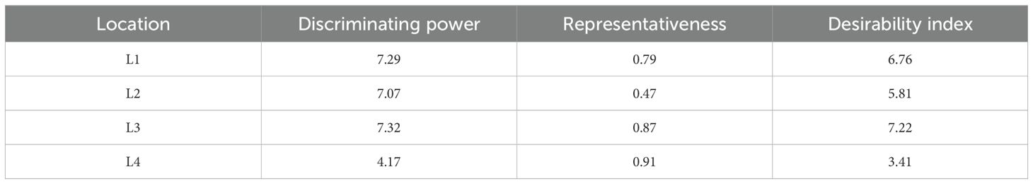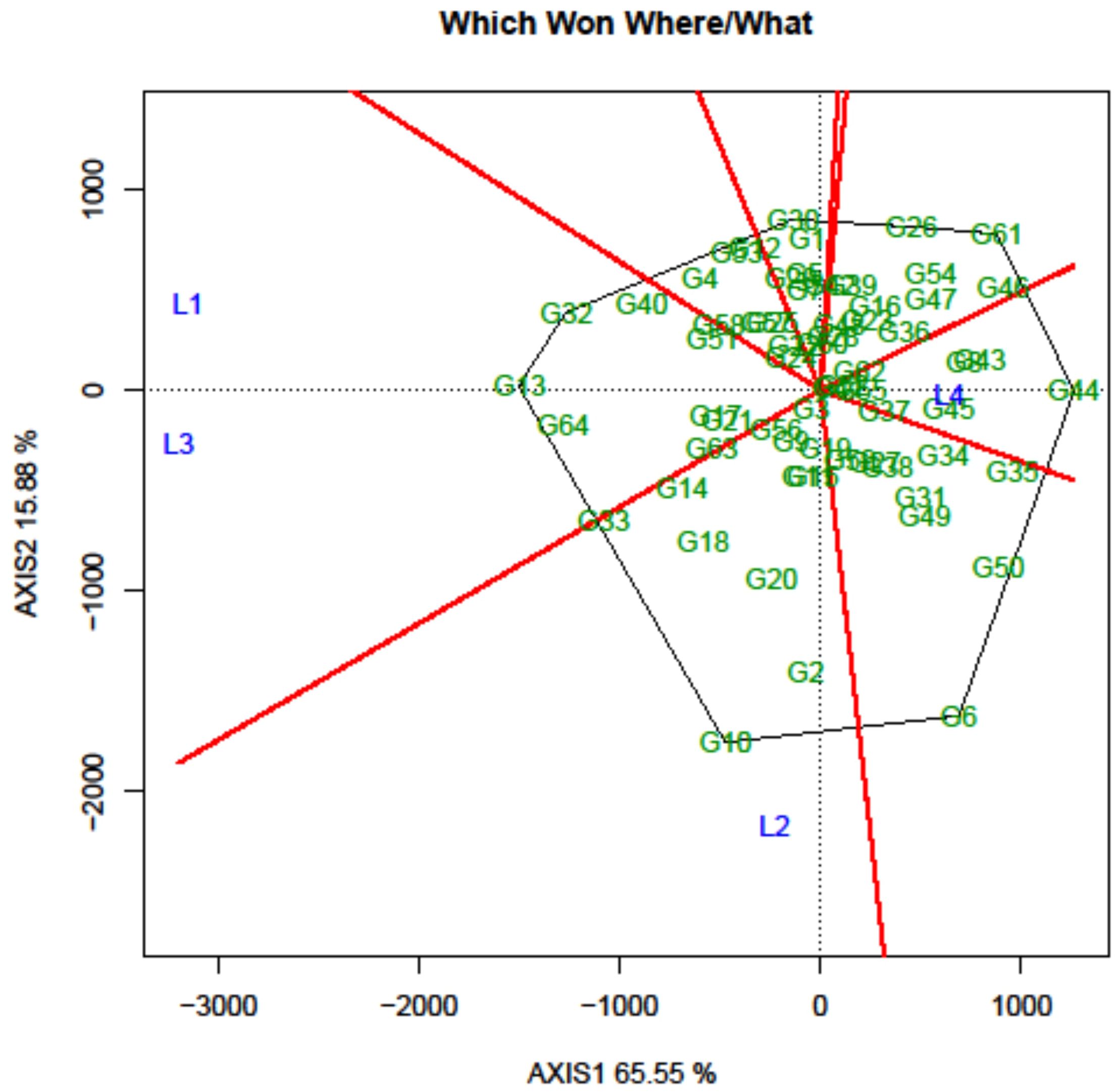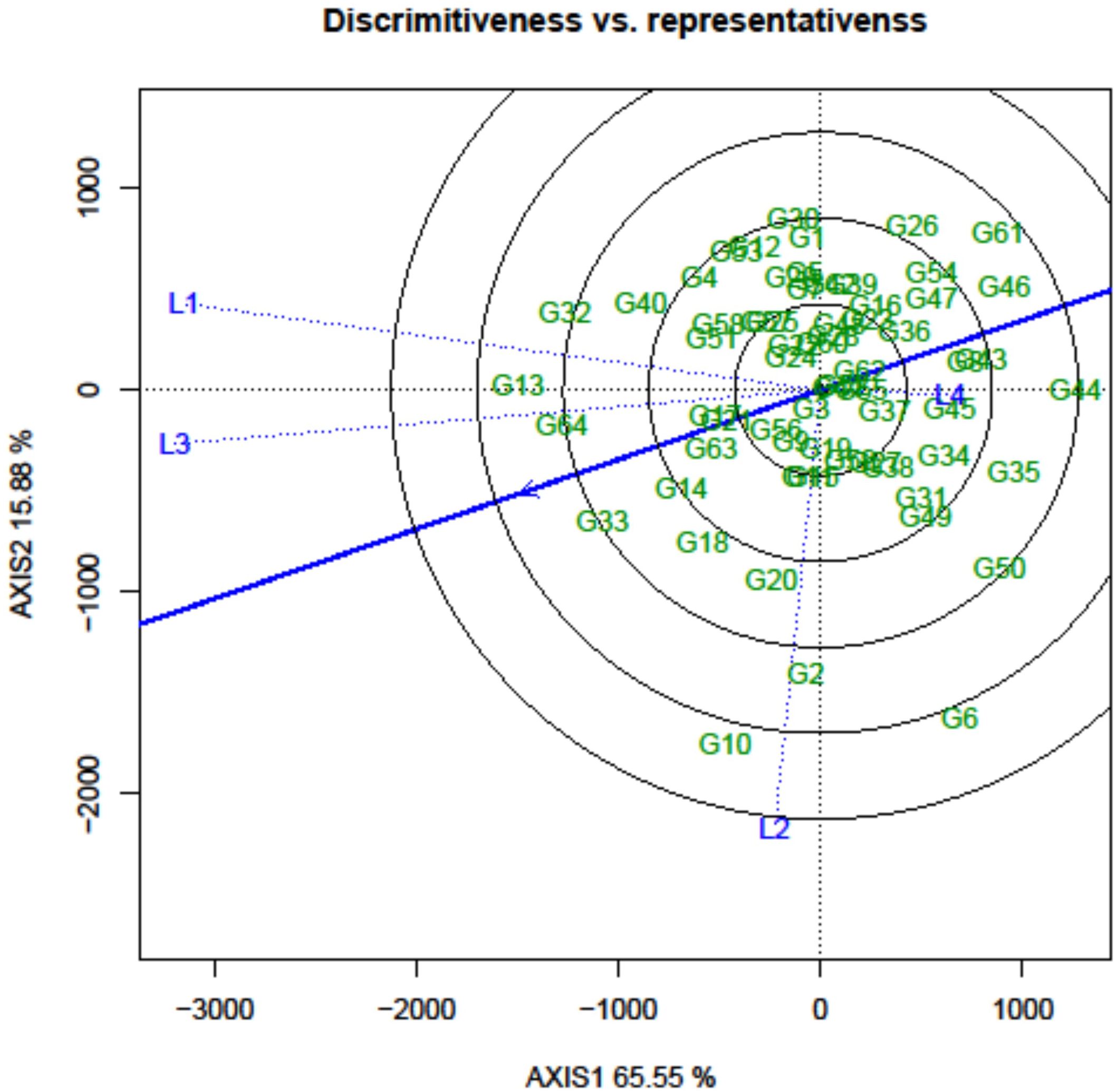 In the GGE biplot approach, the critical factors for identifying desirable testing locations and eliminating redundant ones are discrimination power (ability to discriminate genotypes), representativeness (ability to represent corresponding MEs), and the desirability index. In the “discriminativeness vs. representativeness” view of the GGE biplot, the lines connecting the test environments are referred to as environment vectors. From the graph, it was observed that L1 (Amlaha) and L3 (Mohanpur) revealed an acute angle with each other, while the two remaining locations indicated an obtuse angle (Figure 7).