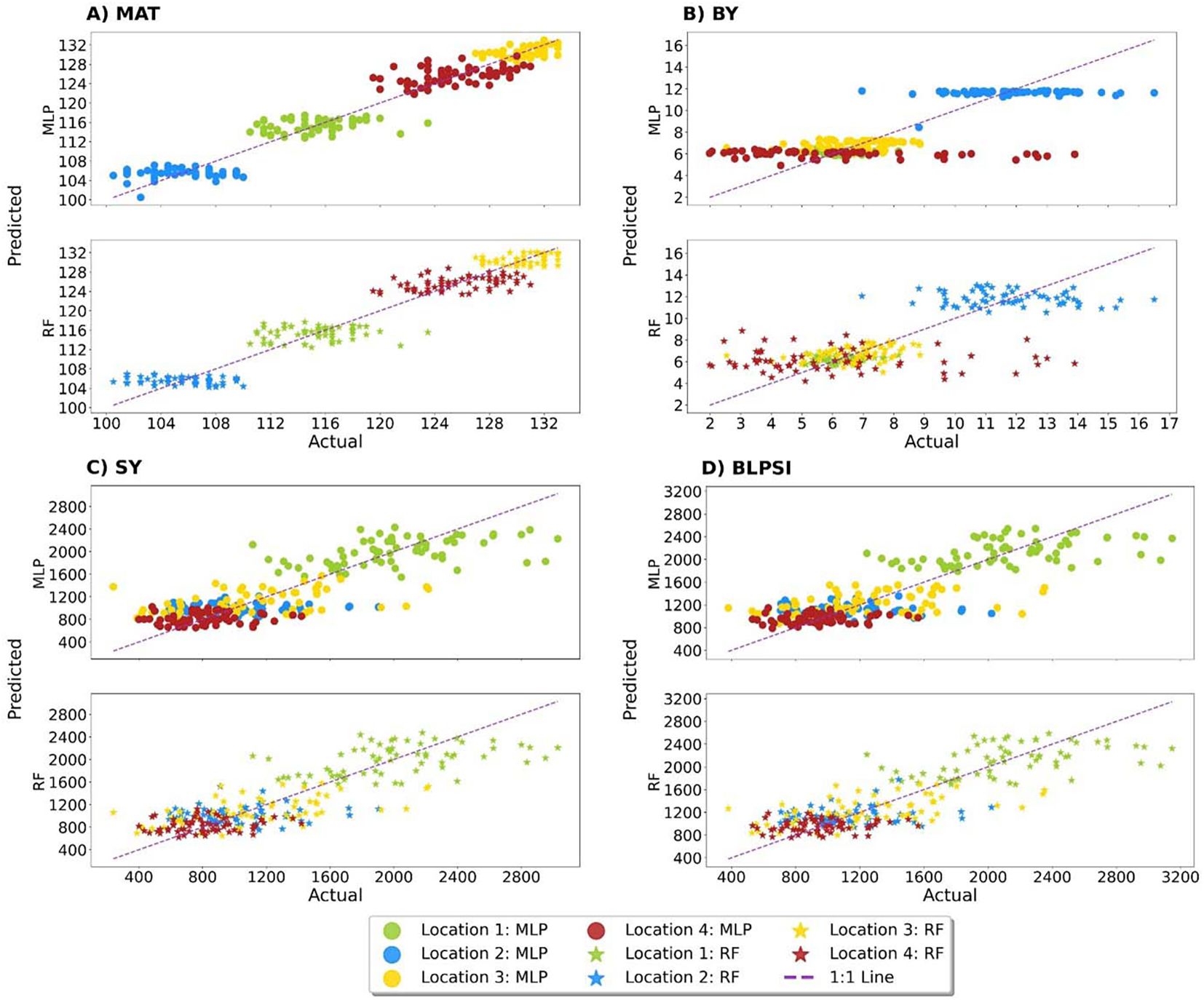 However, despite the recognition of grasspea’s resilience and nutritional potential, little is known about its genotype × environment dynamics when considering multiple traits together rather than single-trait evaluations. Previous studies have not integrated the GGE biplot (Sayar and Han, 2015; Chatterjee et al., 2019) with modern ML approaches for multi-trait stability analysis in grasspea. This study aims to fill this gap by explicitly testing the hypothesis that combining the GGE biplot and ML models will improve the identification of climate-suitable genotypes and optimal testing locations in India. Therefore, the present investigation integrates three objectives: (i) to identify the stable grasspea genotypes by nullifying the effect of complex association of multiple traits; (ii) to find the best locations among the tested zones for future testing of grasspea genotypes; and (iii) to validate and predict results with the aid of decision tree-based Random Forest (RF) and neural network-based multilayer perceptron (MLP) models with six different performance metrics.