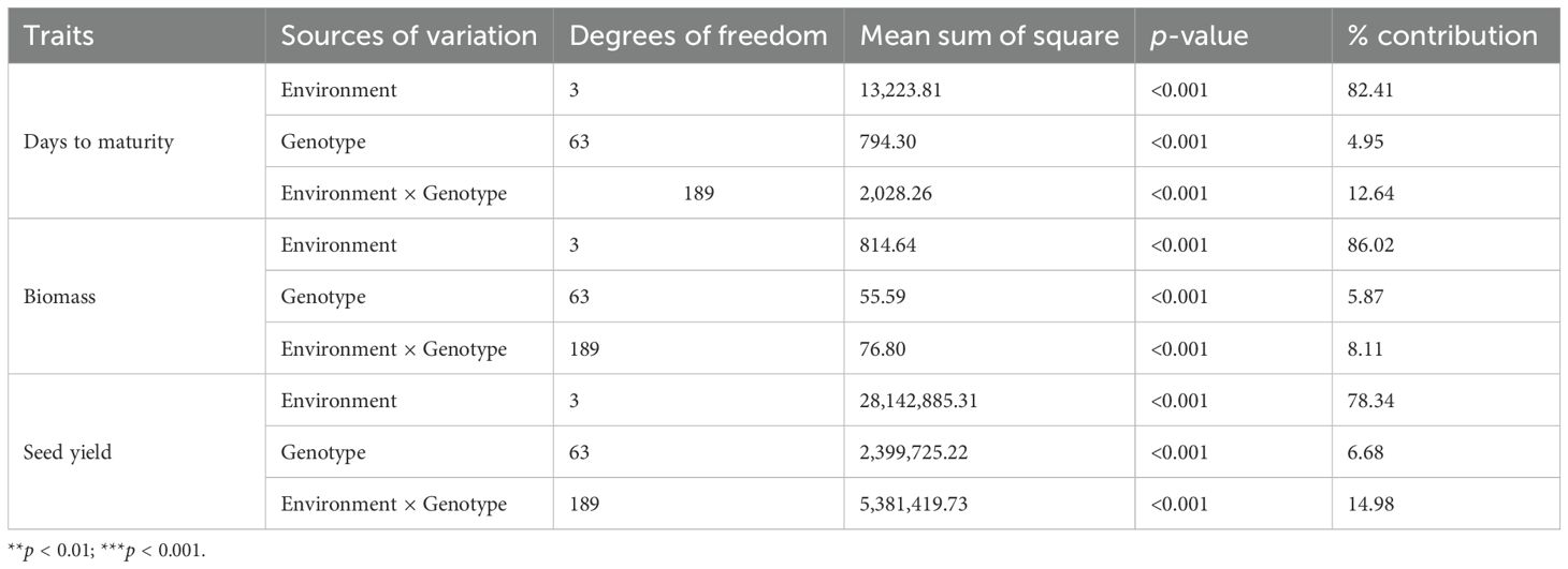 ANOVA showcasing the relative contribution of each source of variation to the total variations is presented in Table 1. The ANOVA results indicated that the effects of genotype (G), environment (E), and their interaction (GE) were all found to be statistically significant for all the traits under investigation. Concerning the relative contribution of various components of variation, it was observed that environment has the highest contribution followed by the GE for all the traits under study. The highest contribution of environment was observed for biological yield (86.02%), whereas the contribution of GE was maximum in seed yield (14.98%). The contribution of genotype exhibited the highest effect on seed yield followed by biological yield.