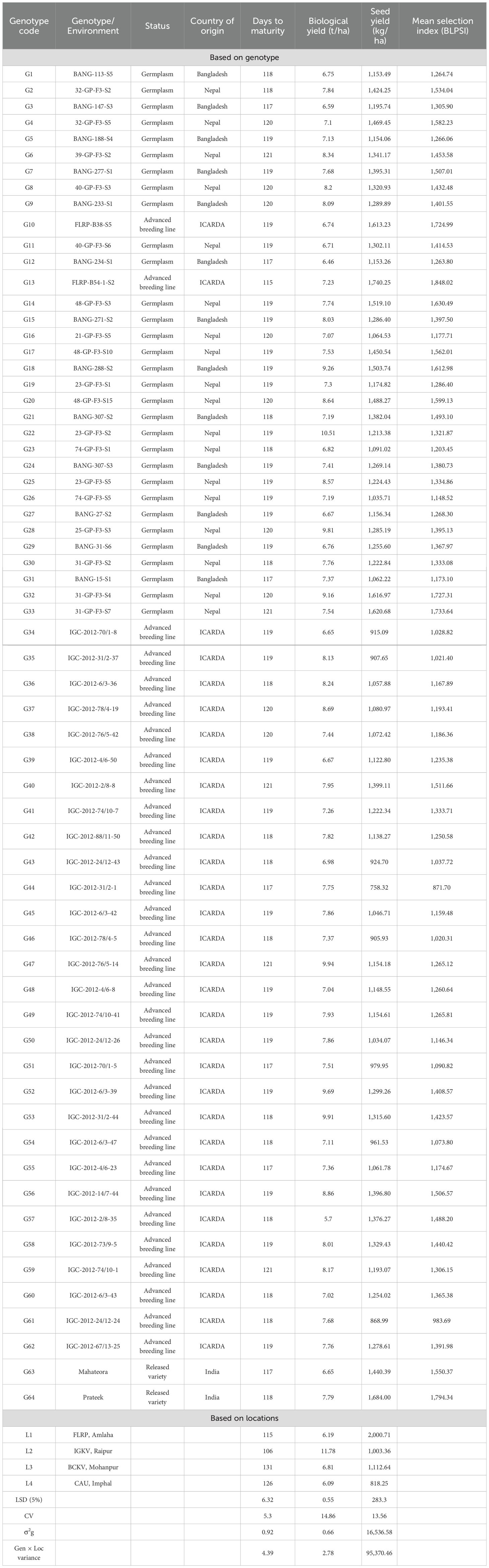 The mean performance of the tested grasspea genotypes considering their maturity, biological yield, and seed yield along with the mean BLPSI is presented in Table 2. Across all locations, FLRP-B54-1-S2 was the early maturity genotype (115 days) with the highest seed yield (1,740.25 kg/ha) potential. The check variety Mahateora matured early along with other six grasspea lines (BANG-147-S3, BANG-234-S1, IGC-2012-4/6-23, BANG-15-S1, IGC-2012-70/1-5, and IGC-2012-31/2-1), although all the genotypes exhibited non-significant differences with each other. Among the locations, genotypes matured early at L2 (106 days) and late in L3 (131 days). Genotypic variance (σ2g) varied between 2.09 (L3) and 6.24 (L4) for the days to maturity trait. Biological yield was significantly highest in genotype 23-GP-F3-S2 (10.51 t/ha) followed by IGC-2012-76/5-14 (9.94 t/ha). Genotypes exhibited the highest biological yield in L2 (11.78 t/ha), which was approximately 52% higher than the average biological yield of the genotypes over the locations. In contrast, L4 (Imphal) exhibited the lowest biological yield (6.09 t/ha), which was approximately 26% lower than the average biological yield of the tested grasspea genotypes over the locations. For this trait, genotypic variance ranged from 0.28 (L1) to 7.45 (L4).