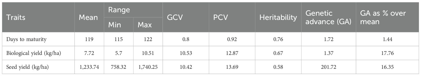 Genetic parameters of the 64 grasspea genotypes for three traits over the locations are presented in Table 3. The mean value for days to maturity was found to be 119 days, and across all the genotypes and locations, the maturity period ranged from 115 to 122 days. In the case of biological trait, moderate variability was observed. Maximum variability was reflected in the case of seed yield and varied between 758 and 1,740 kg/ha. Heritability for maturity (76%) and biological yield (67%) was high, whereas for seed yield, it was moderate (58%).