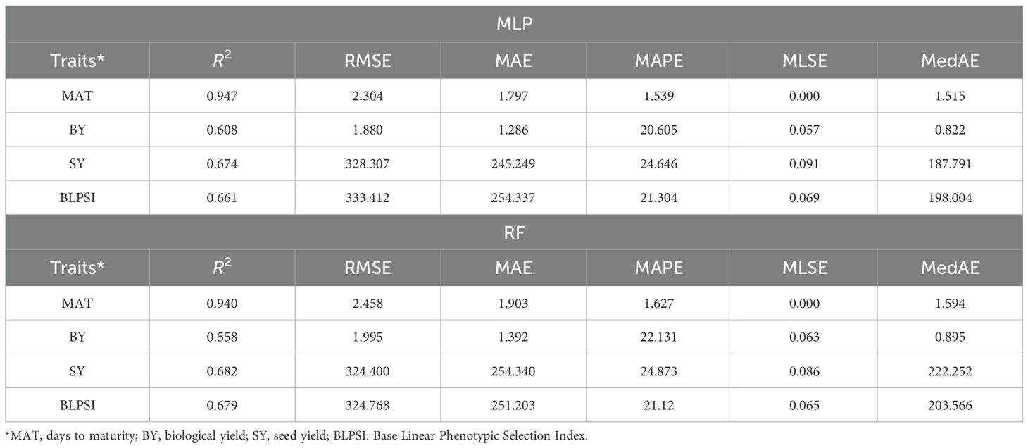 In this study, decision tree-based RF models and artificial neural network-based MLP were utilized for the validation and prediction of different agronomic traits. Both models were chosen for their versatility in handling regression and classification tasks, providing robust predictive capabilities (Hesami et al., 2019; Everingham et al., 2016). RF is a decision tree model that trained multiple trees simultaneously and uses bagging, also known as bootstrap aggregation, for trained trees and showing the final outcome (Pavlov, 2019). The fundamental idea behind the RF model is presented in Equation 1.