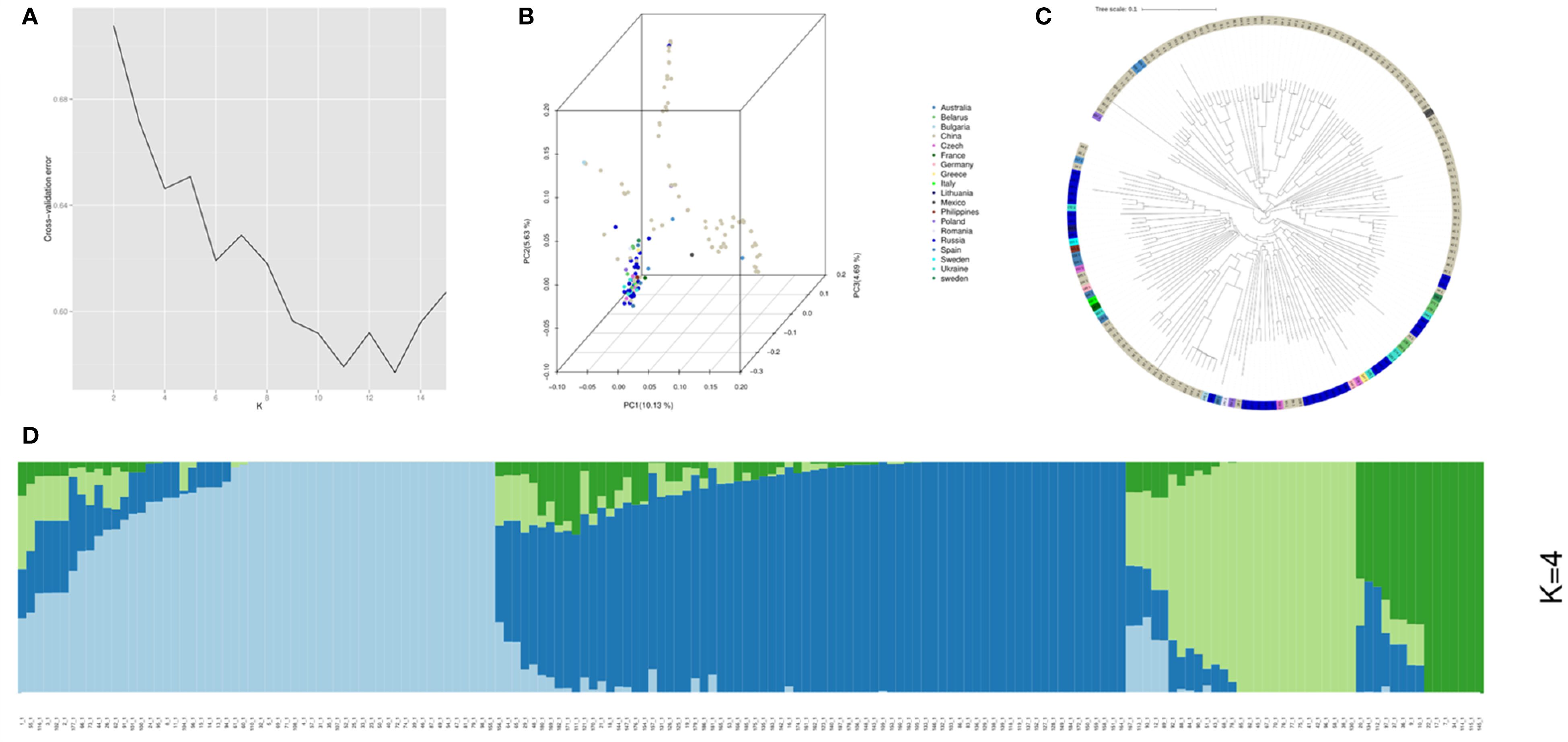 Figure 2. Population structure analysis for the 172 common vetch accessions. (A) The cross-validation error (CV error) for population structure analysis was assessed, with the lowest error (CV error = 0.62) observed at K=4. (B) Principal component analysis (PCA) was performed on the 172 common accessions. (C) A Neighbor-Joining tree was constructed for the 172 common vetch accessions. (D) Population structure analysis was conducted for the diverse panel.