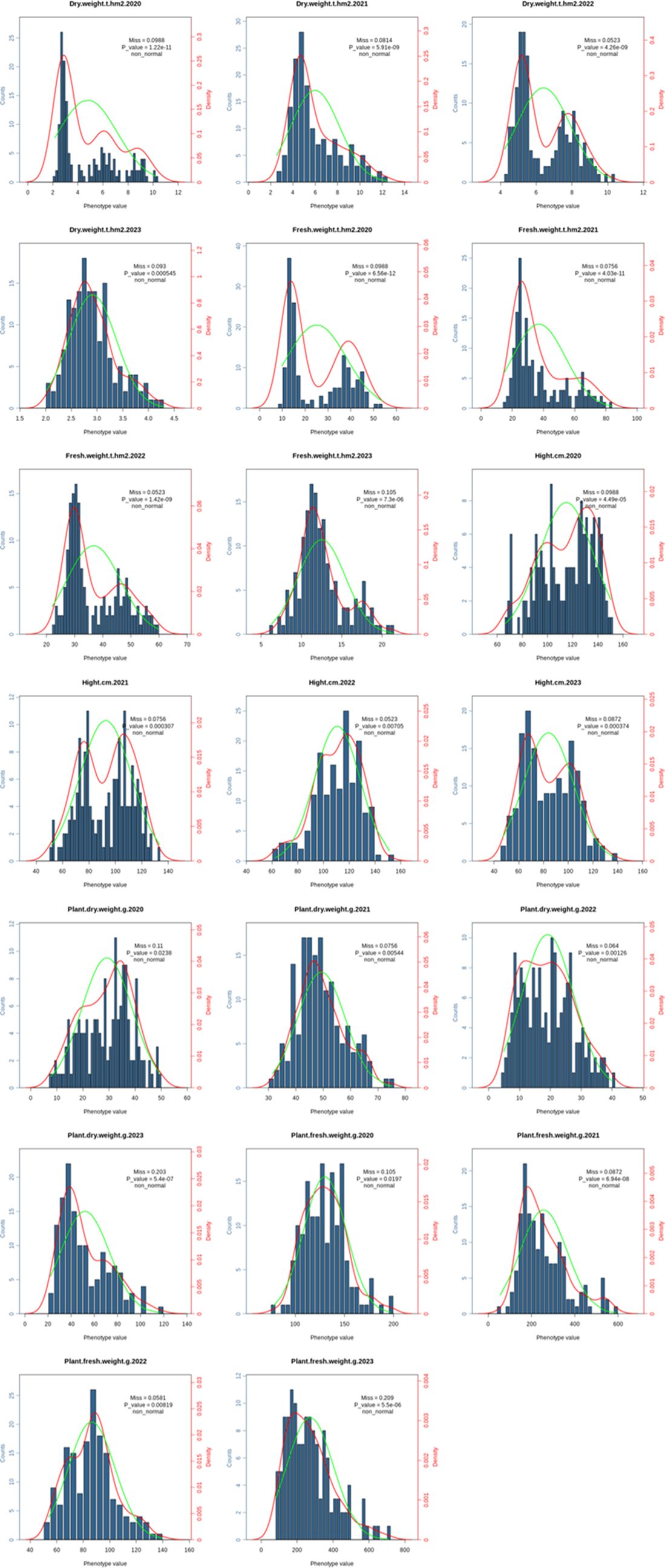 Biomass-related traits, including fresh weight (FW), dry weight (DW), fresh weight per plant (PFW), dry weight per plant (PDW), and plant height (PH), were evaluated following the methods described by Cao et al. (2007). PH was measured as the natural height from the base to top of the main stem. FW represents the fresh biomass yield per unit area, while DW indicates the dry biomass yield per unit area. Similarly, PFW refers to the fresh biomass yield per plant, and PDW denotes the dry biomass yield per plant. During the full flowering stage, 10 plants were randomly selected from each plot to measure PH. Additionally, three 1 m sample sections (excluding border rows) were randomly chosen from each plot to determine FW by averaging the fresh weight. The sampled fresh biomass was first placed in a 105°C oven for 30 min to deactivate enzymes and then dried at 70°C until a constant weight was achieved to record DW.