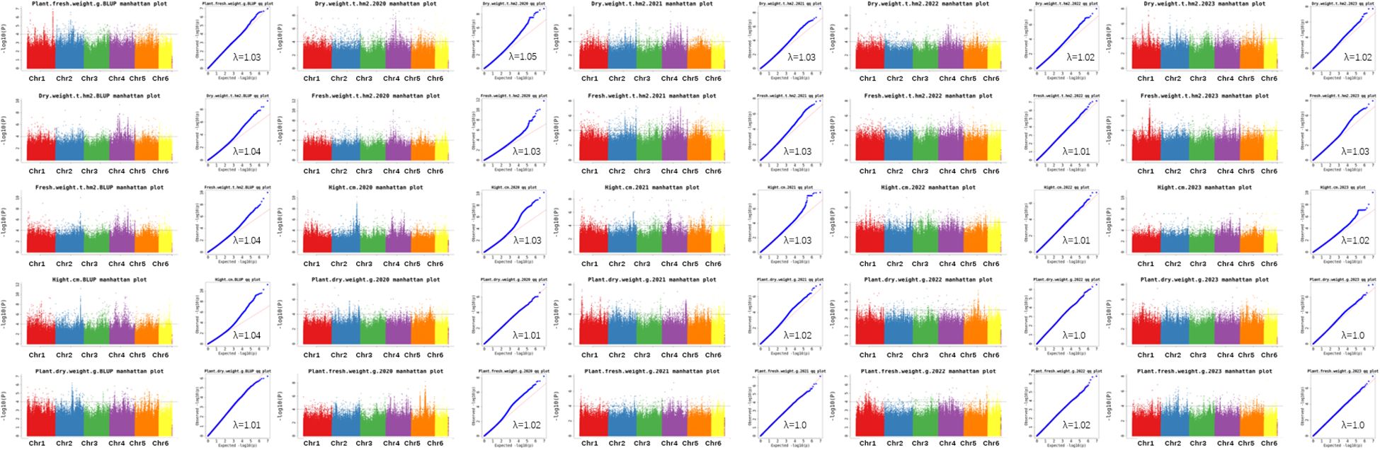 Figure 4. The Manhattan and Q-Q plot for the 5 biomass related traits in 172 common vetch accessions.
