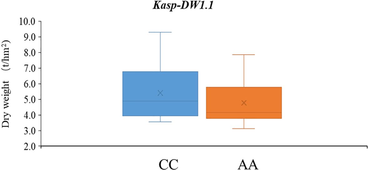 To support MAS breeding in common vetch, four SNPs with stable or high PVEs were selected to convert into KASP markers. Among these, only SNP within the genetic interval of qDW1.1 was successfully converted into a functional KASP marker, and named as Kasp-DW1.1. Genotypic consistency analysis showed that Kasp-DW1.1 achieved over 90.1% concordance with resequencing data, confirming its accuracy in reflecting true genotype. Validation in a diverse panel revealed that accessions carrying the favorable allele (CC, 63 lines) had significantly higher DW (mean = 5.40) compared to those with the unfavorable allele (AA, 75 lines; mean DW = 4.74) (P < 0.05) (Supplementary Tables S8, S9; Figure 5).