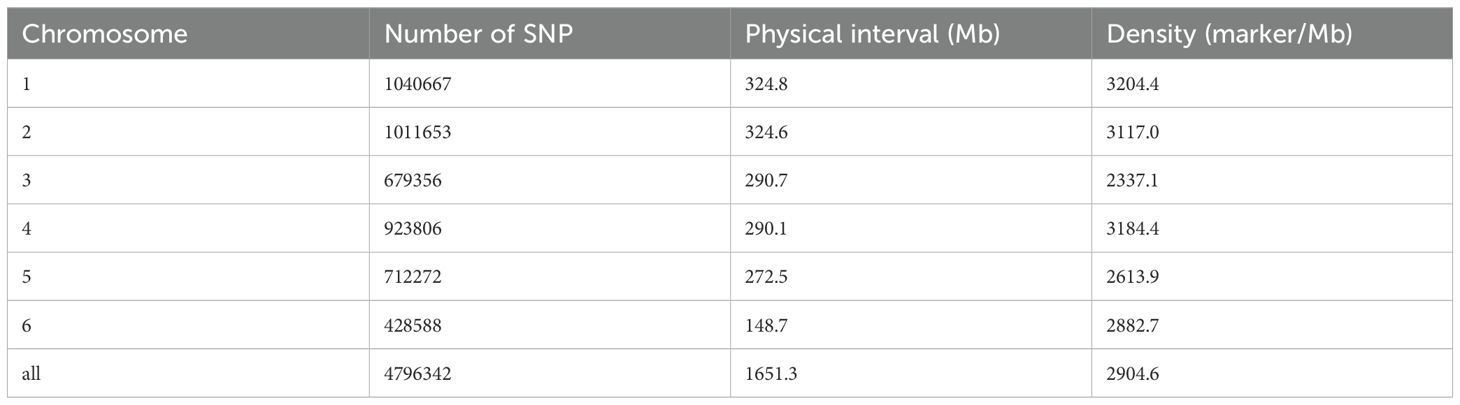 Totally, 4,796,342 high-quality SNPs distributed across all 6 chromosomes were identified by whole-genome resequencing of 172 common vetch accessions, with an average density of 2,904.6 SNPs/Mb (Table 1; Supplementary Table S2). The genome-wide SNP distribution revealed substantial variations in marker density across tall the whole genome. Among these, chromosome 1 exhibited the highest SNP abundance with 1,040,667 identified variants spanning 324.8 Mb, yielding a marker density of 3,204.4 SNPs/Mb. Chromosome 2 followed closely with 1,011,653 SNPs across a similar physical length (324.6 Mb), resulting in a slightly lower density of 3,117.0 SNPs/Mb. Chromosome 4 demonstrated notable SNP clustering, containing 923,806 variants within a relatively compact 290.1 Mb physical interval, achieving the second-highest density (3,184.4 SNPs/Mb). In contrast, Chromosome 3 displayed reduced polymorphism with 679,356 SNPs across 290.7 Mb (2,337.1 SNPs/Mb), while chromosome 5 showed moderate density (2,613.9 SNPs/Mb) from 712,272 SNPs distributed over 272.5 Mb. Chromosome 6 emerged as an outlier, hosting 428,588 SNPs within the shortest physical interval (148.7 Mb), yet maintaining a relatively high density of 2,882.7 SNPs/Mb. Collectively, the 4,796,342 high-quality SNPs covering a total physical distance of 1,651.3 Mb with an average density of 2,904.6 SNPs/Mb.