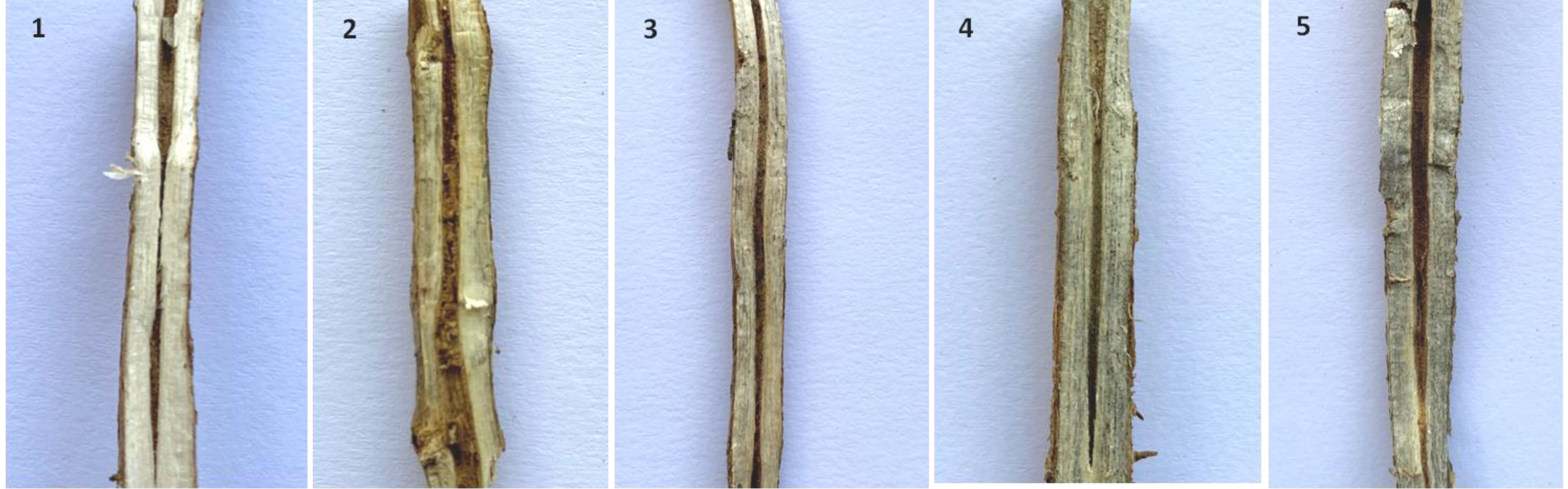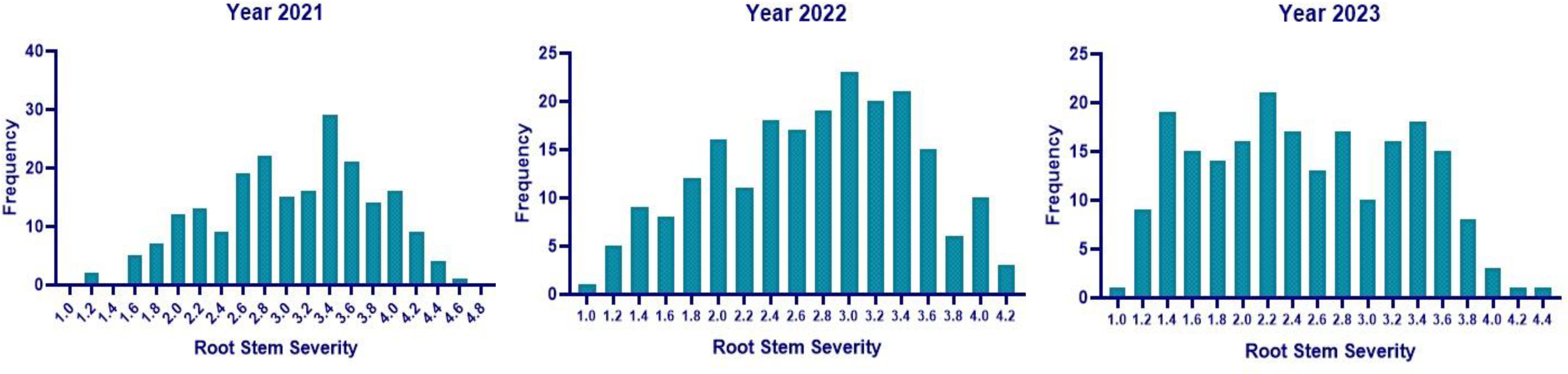 Figure 3. Phenotyping of germplasm accessions through the root stem severity (RSS) index. Disease rating scale (1–5) was as per Mengistu et al. (2007).