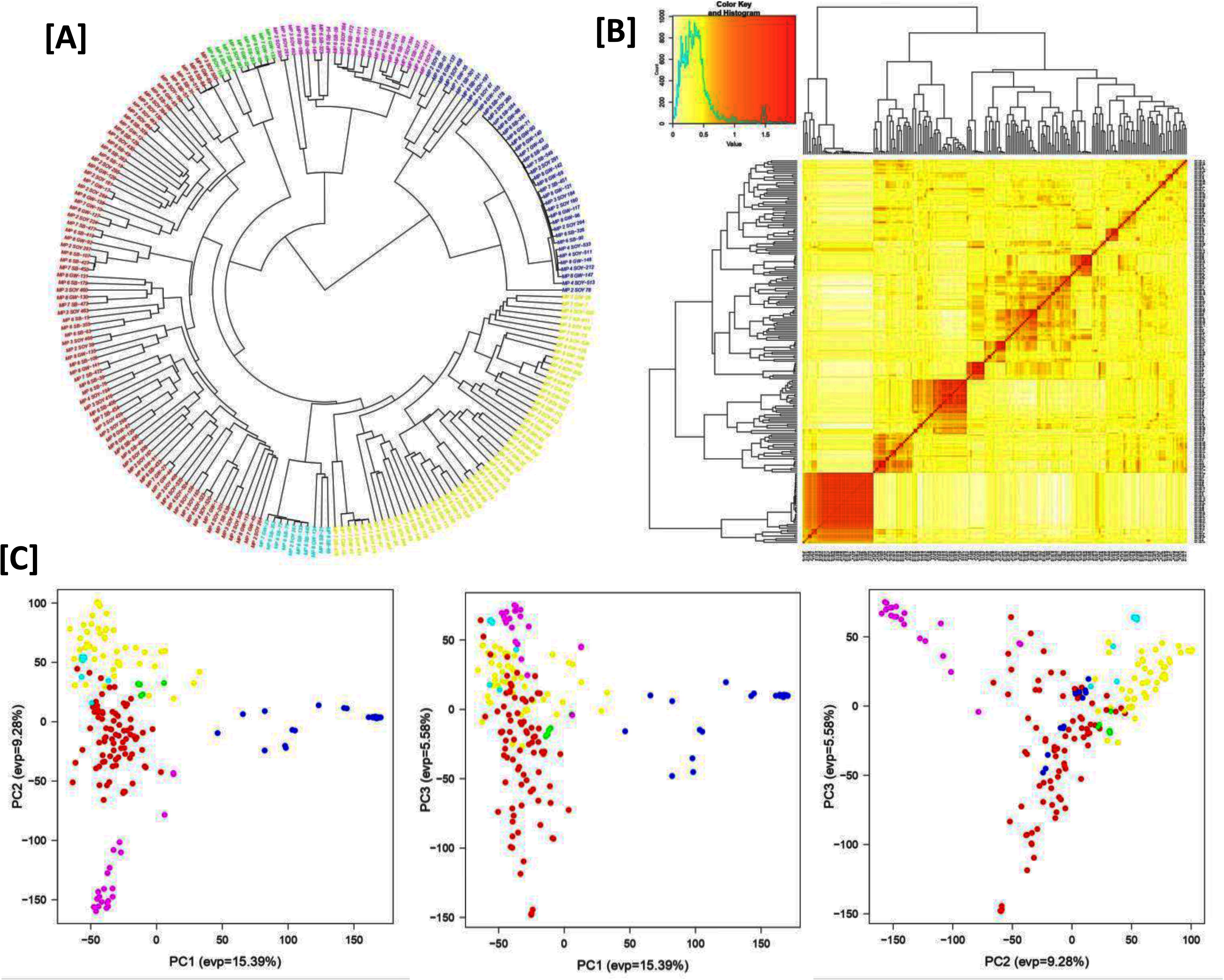 Figure 4. Genetic diversity and relatedness of the soybean germplasm accessions. (A) Neighbor-joining tree constructed using 66,976 SNP data. A total of six different clades were observed in our GWAS panel. (B) A kinship plot. A heat map of the values in the kinship matrix, showing the level of relatedness among the GWAS panel (the darker area showing a highly related genotype and also from a different origin with the rest of the population). (C) 2D principal component analysis (PCA) for the entire GWAS panel derived from SNP data.