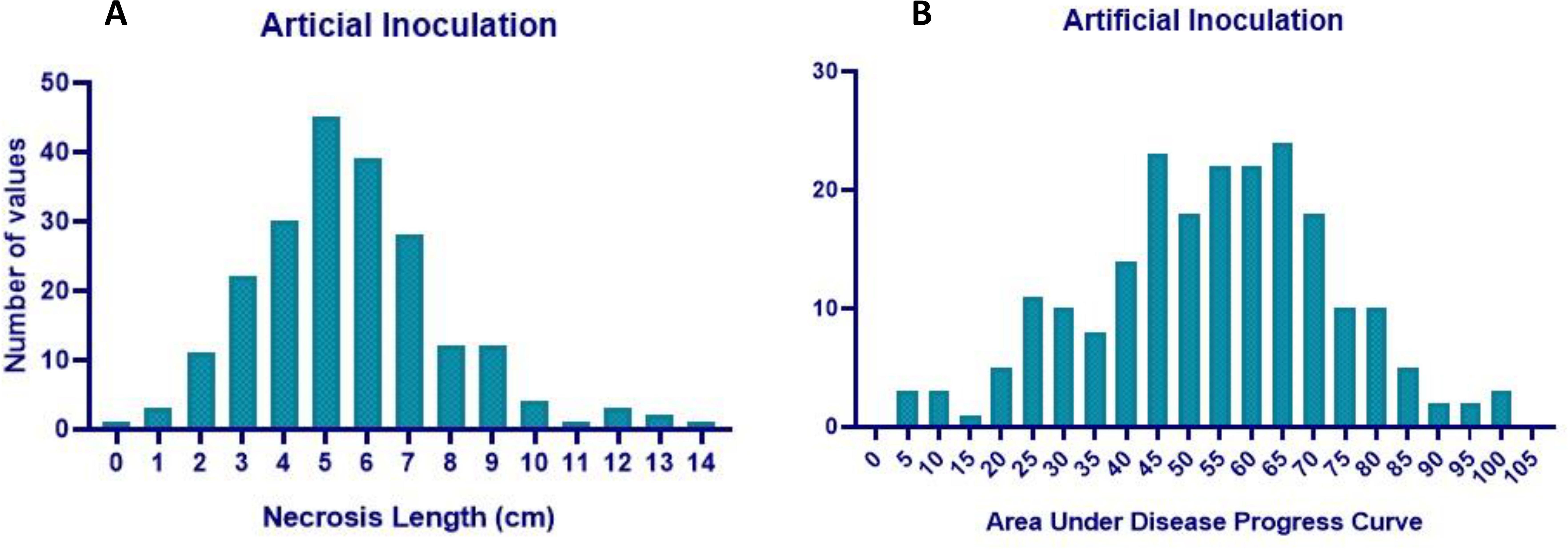 Analysis of variance (ANOVA) indicated a significant genotypic effect for AUDPC and necrosis length. Mean AUDPC was 53.82, ranging from 4.62 to 102.27, while mean necrosis length was 5.58 cm with a range of 0.48–13.80 cm (Table 1). The top 10 best genotypes in the case of AUDPC were MACS 1520 (4.62), IC 15759 (5.00), B 1667 (6.93), Young (8.27), Bragg (8.79), MACS 13 (12.30), PI 159923 (13.22), PK 262 (17.97), EC 251498 (18.56), and TGX 86-24-1D (20.68). The top 10 best genotypes in the case of necrosis length were MACS 1520 (0.48 cm), Bragg (0.95 cm), IC 15759 (1.05 cm), PI 159923 (1.25 cm), EC 251498 (1.72 cm), TGX 86-24–1 D (1.95 cm), PK 262 (1.95 cm), Young (2.04 cm), B 1667 (2.10 cm), and EC 457305 (2.15 cm) (Table 2) The frequency distribution of the panel for necrosis length and AUDPC is depicted in Figure 5.