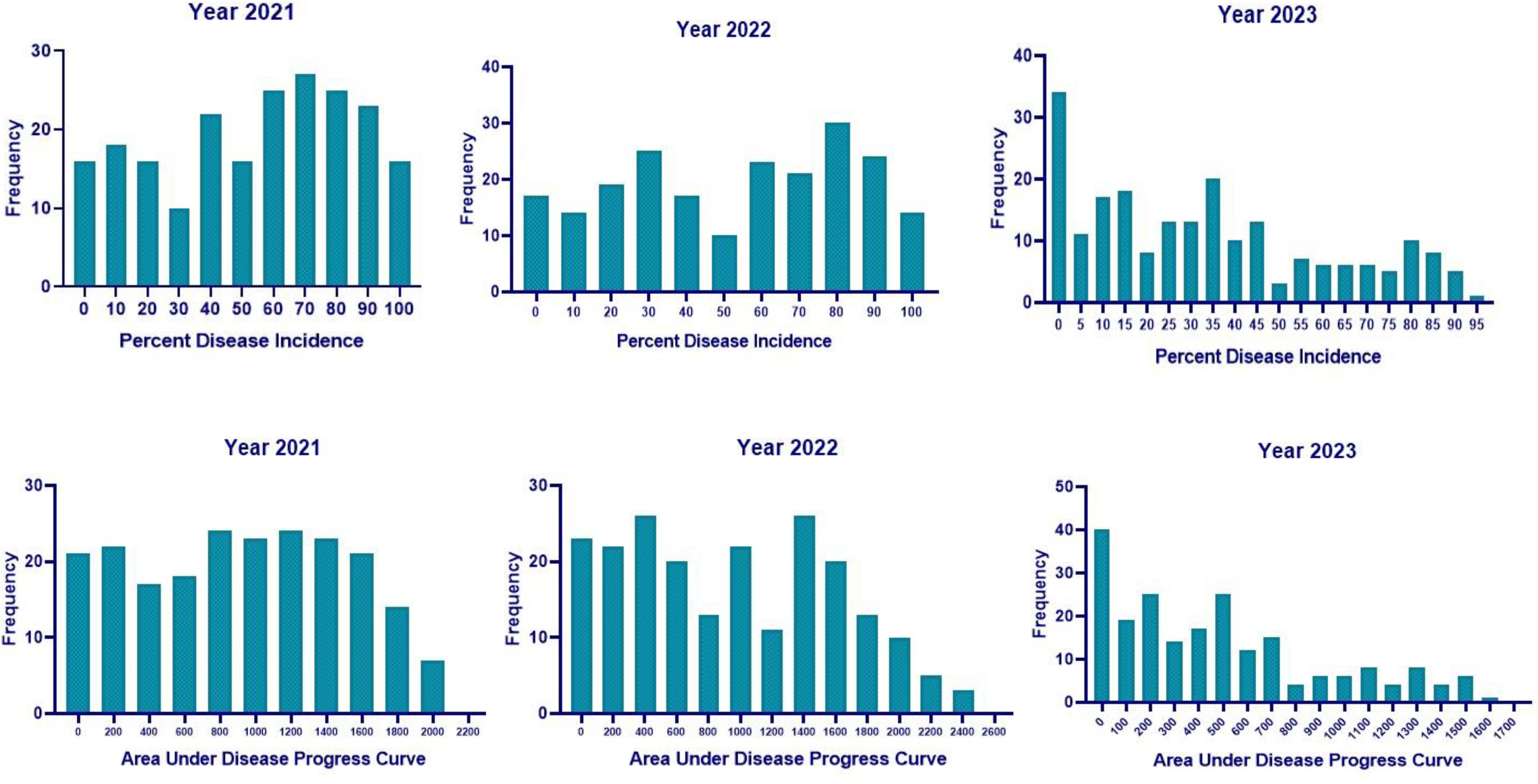 The mean RSS index was 3.07, 2.72, and 2.50 during 2021, 2022, and 2023, respectively. During 2021, the mean AUDPC was 929.02, while it was 944.18 and 481.64 during 2022 and 2023, respectively (Table 4). The 10 best-performing genotypes with respect to PDI were PI 159923 (0.0%), AGS 25 (0.69%), EC 602288 (1.58%), EC 393231 (1.85%), Lesoy 273 (1.85%), Pusa 16 (3.09%), NRC 2396 (3.17%), AMS 100-39 (3.61%), BRG 1 (3.80%), and EC 457516 (3.93%). In the case of AUDPC, the 10 best-performing genotypes were PI 159923 (0.00), AGS 25 (2.43), Lesoy 273 (6.48), EC 393231 (32.40), EC 602288 (38.88), NRC 2396 (44.44), Pusa 16 (50.48), PI 371609 (52.77), AMS 100-39 (54.62), and MAUS 71 (56.81). Genotypes EC 393231 (1.31), PI 159923 (1.35), BRG 1 (1.48), AGS 25 (1.51), JS 20-73 (1.51), NRC 2396 (1.55), JS 20-76 (1.55), EC 602288 (1.55), MAUS 71 (1.57), and Pusa 16 (1.57) were found to have the least RSS score (Table 5). The frequency distribution of the panel for PDI and AUDPC is depicted in Figure 6 and RSS is depicted in Figure 7.