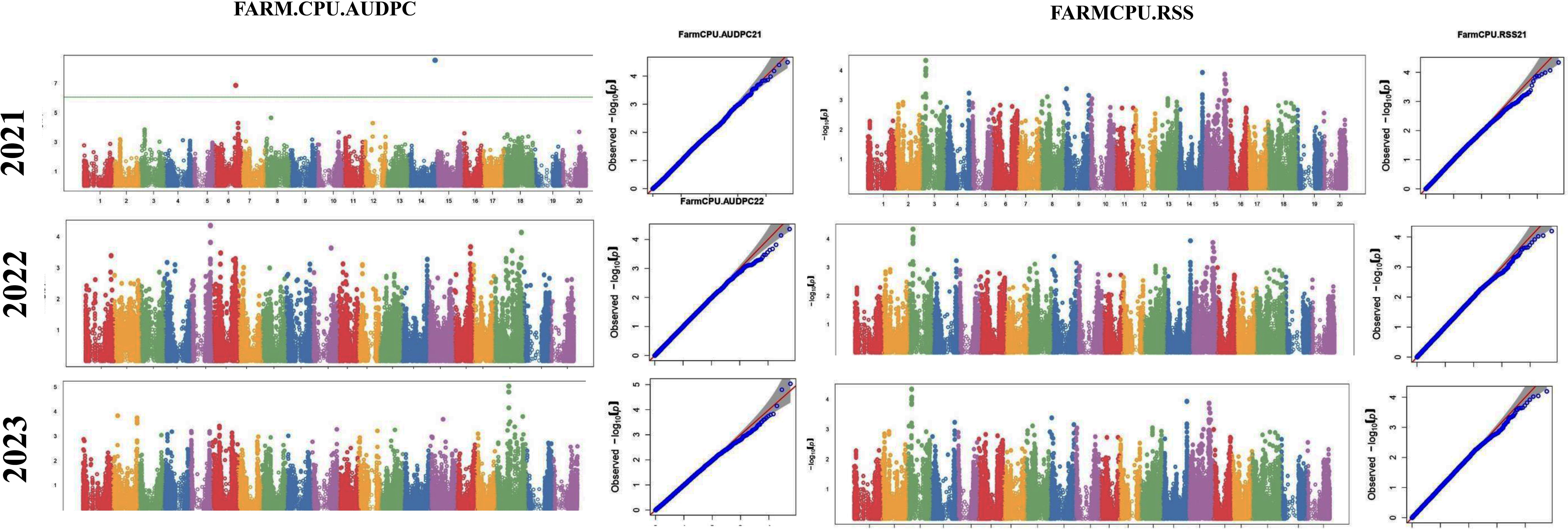 Figure 9. Manhattan plots (left) and quantile–quantile (Q–Q plots) (right) of the genome-wide association results for AUDPC generated through FarmCPU and BLINK in 2021, 2022, and 2023.
