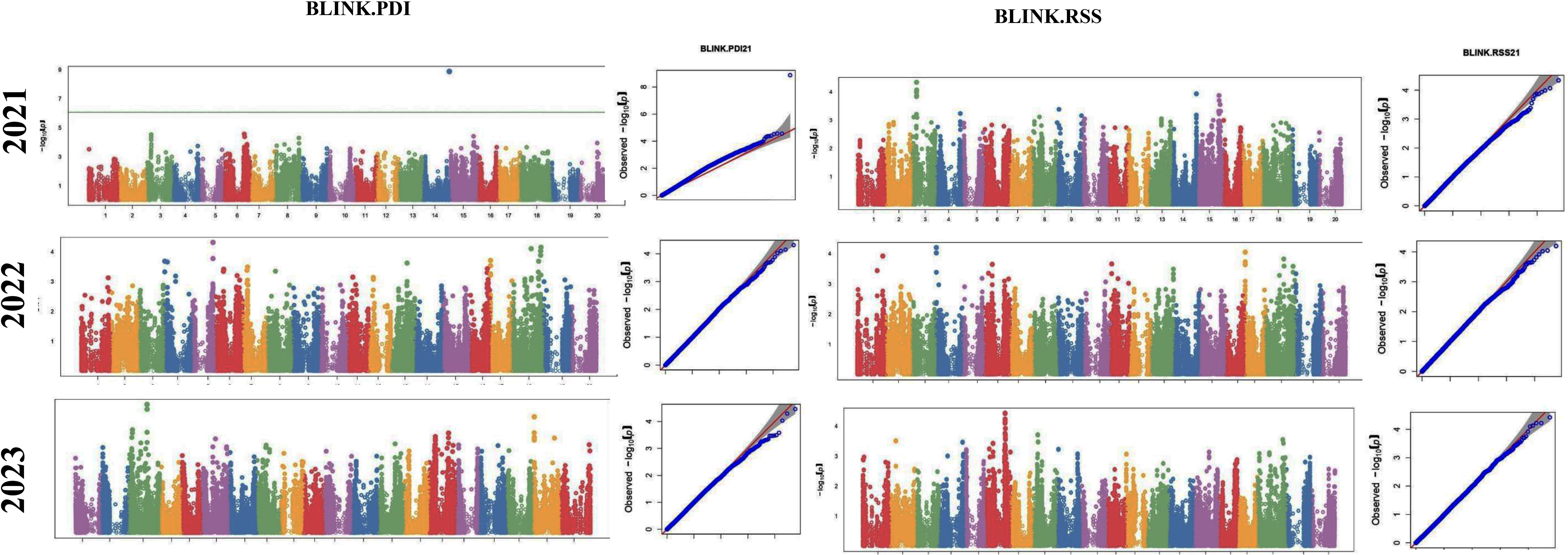 Figure 11. Manhattan plots (left) and quantile–quantile (Q–Q plots) (right) of the genome-wide association results for RSS generated through BLINK in 2021, 2022, and 2023.