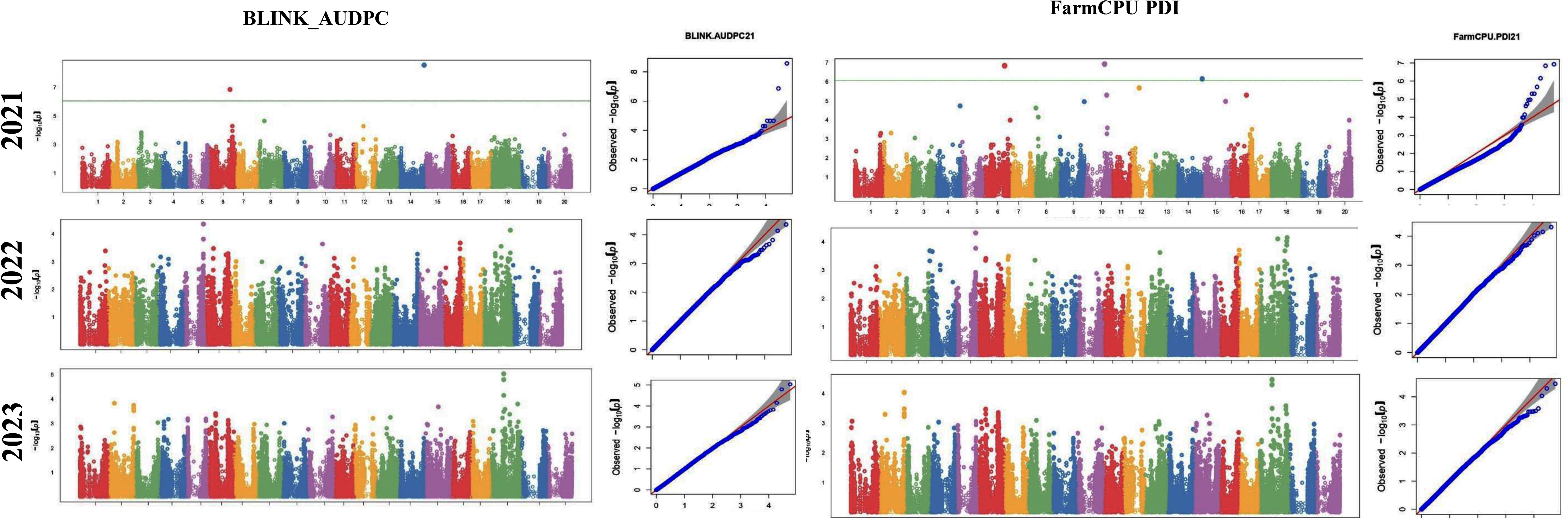 Figure 10. Manhattan plots (left) and quantile–quantile (Q–Q plots) (right) of the genome-wide association results for PDI generated through FarmCPU and AUDPC through BLINK in 2021, 2022, and 2023.