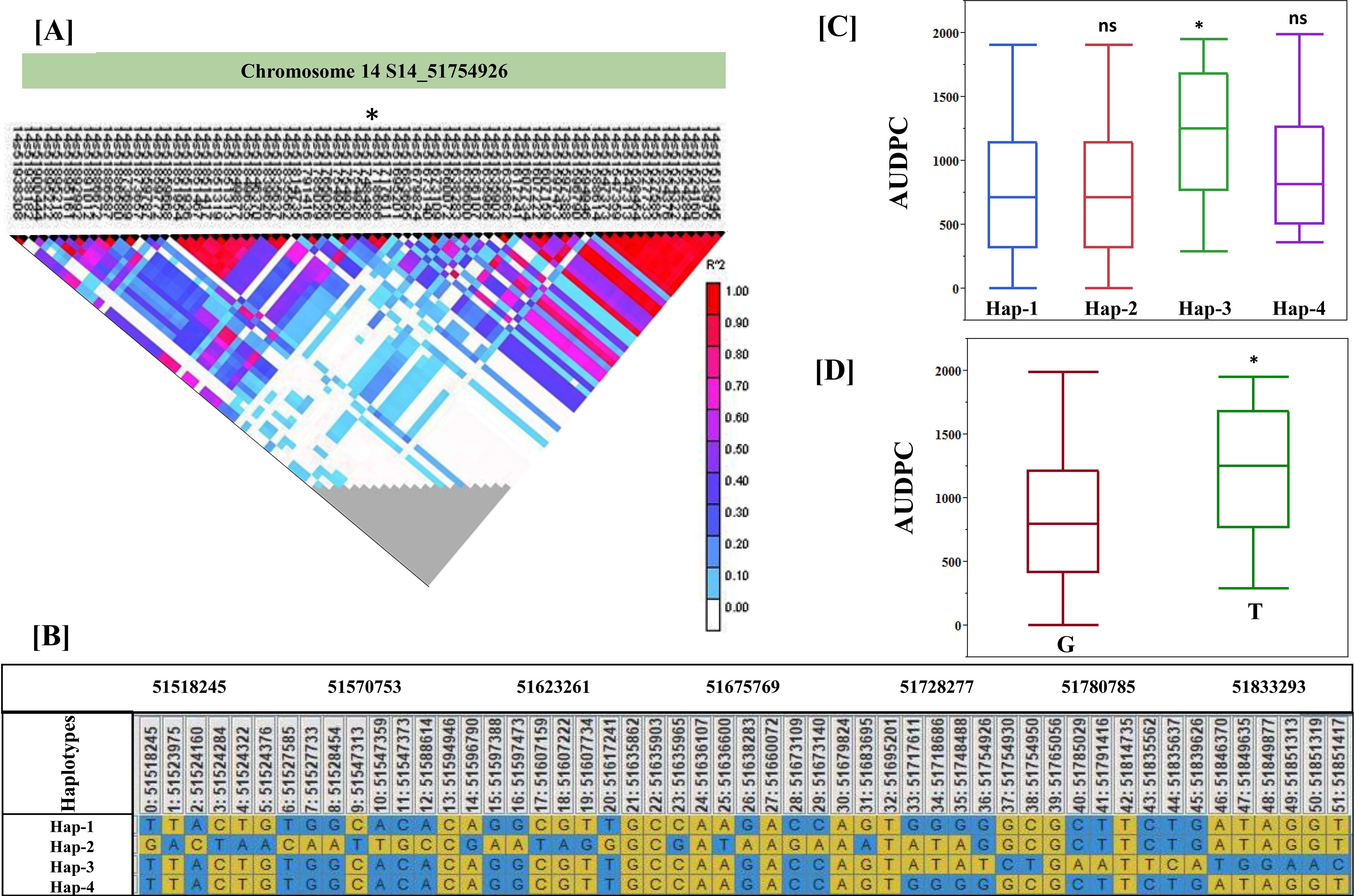 Figure 12. Haplotype analysis. (A) Significant SNPs on chromosome 14. (B) Four major haplotypes: Hap1, Hap2, Hap3, and Hap4. (C) Haplotype association with AUDPC. (D) Allelic effect on AUDPC. * - significance at p<0.05, ns - non-significance.